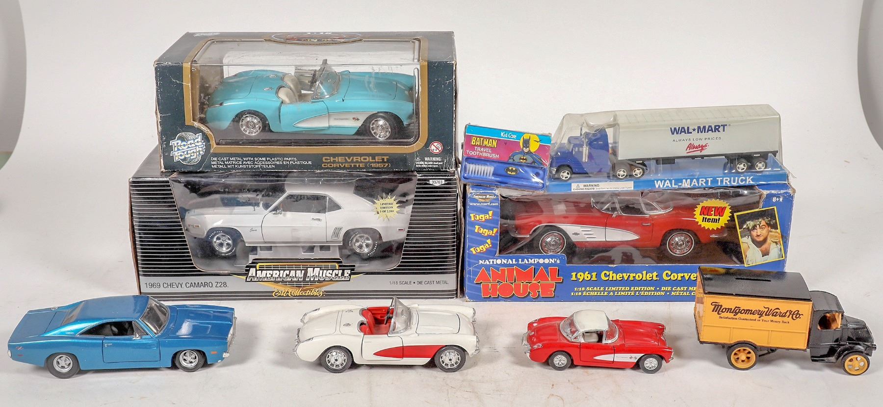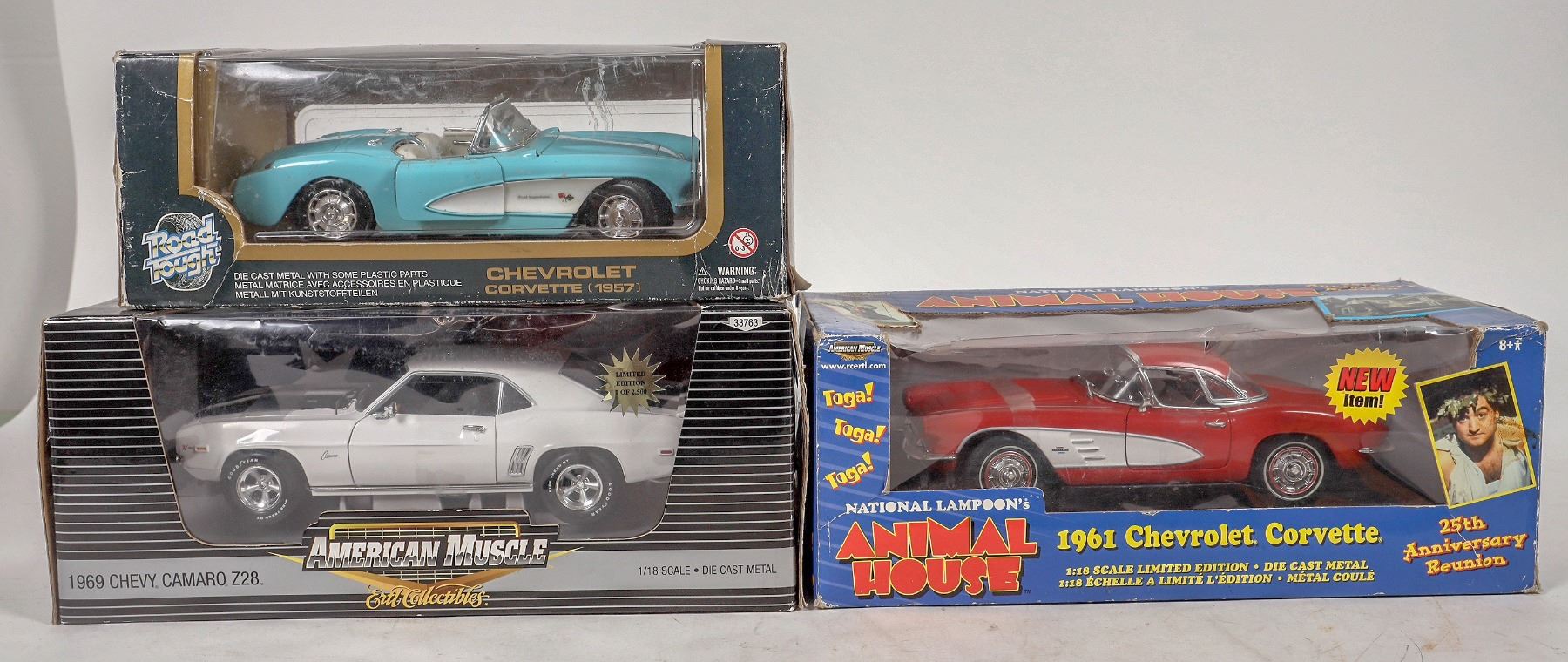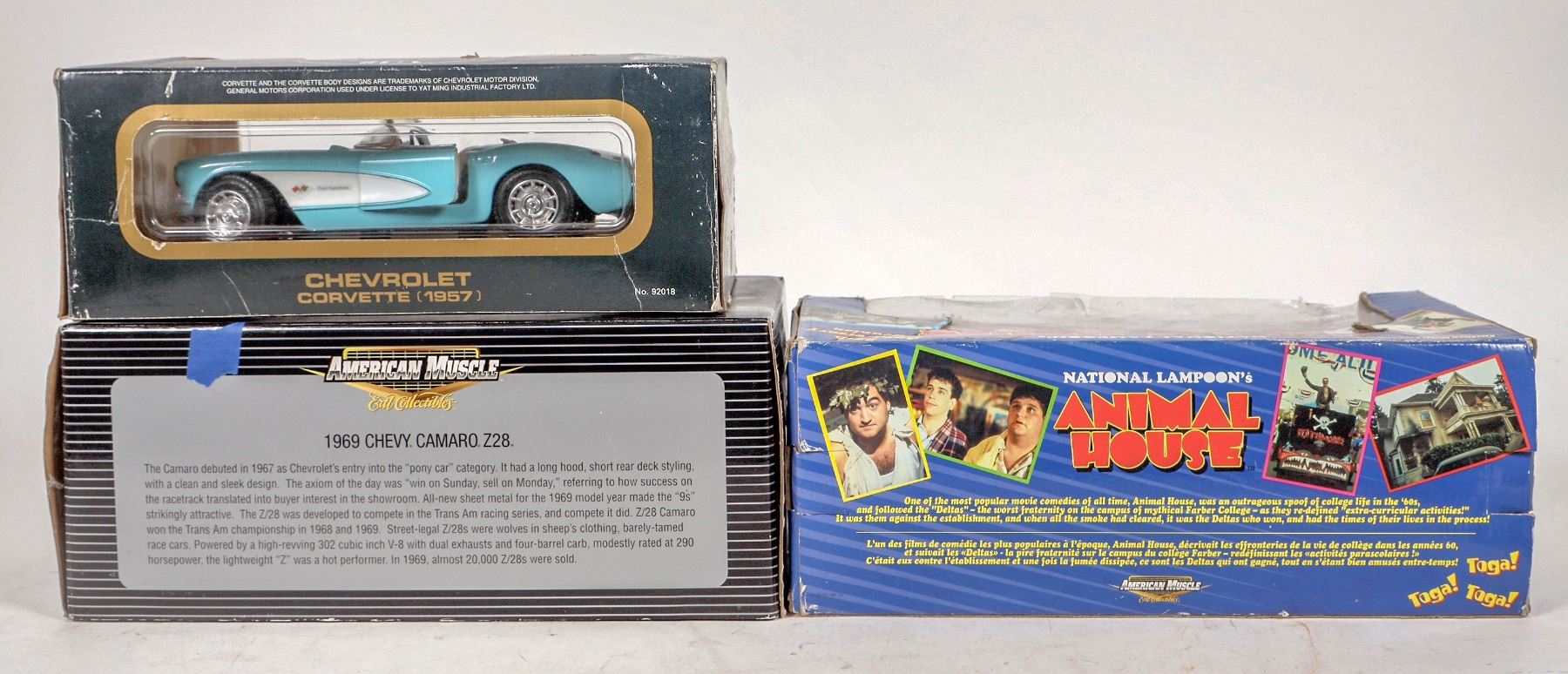 A group of eight toy muscle cars including from Muscle brand "The 25th Anniversary of Animal House" 1961 Corvette in 1/18 scale. There's also a 1/18 scale 1969 Chevy Camaro Z28 and a 1/18 scale 1957 Corvette. There are a few other toy vehicles with this package. All appear to be in nice condition. Please see photos for more details. 10-12” L ea.