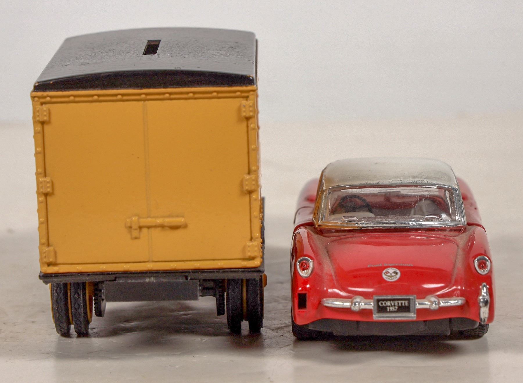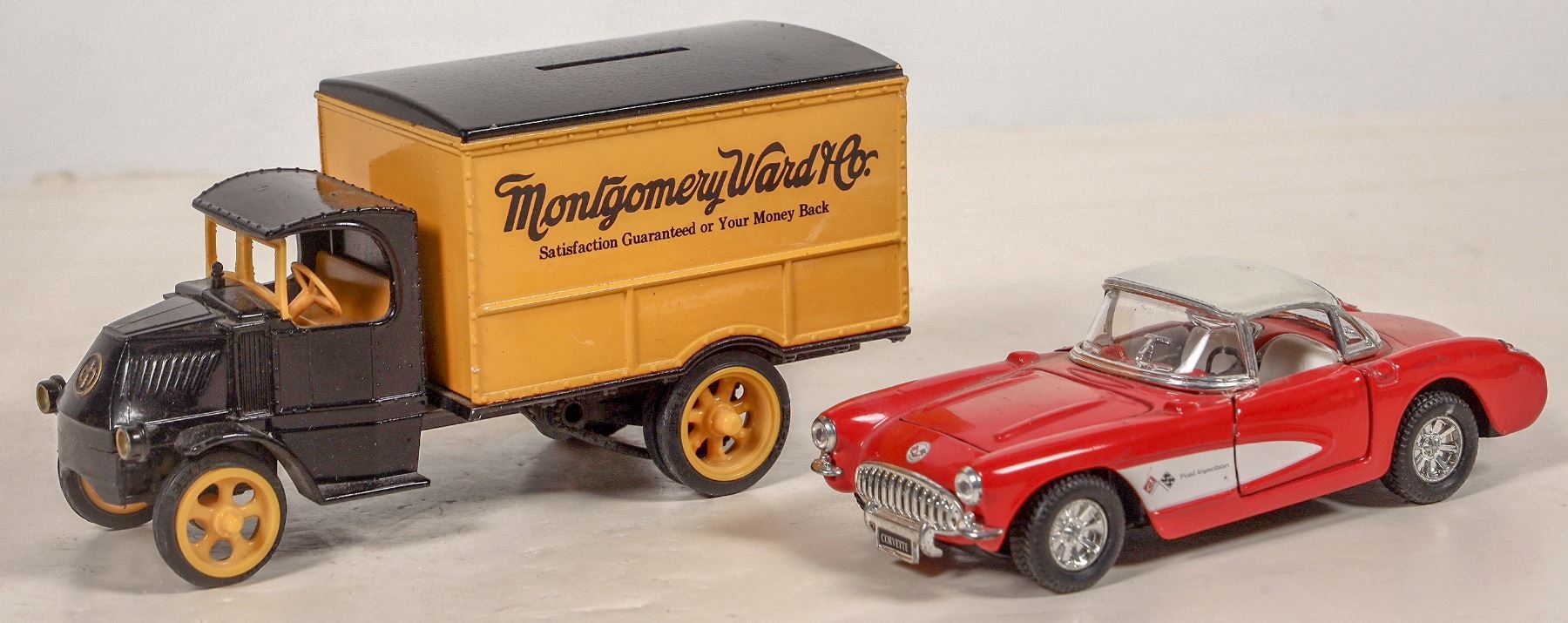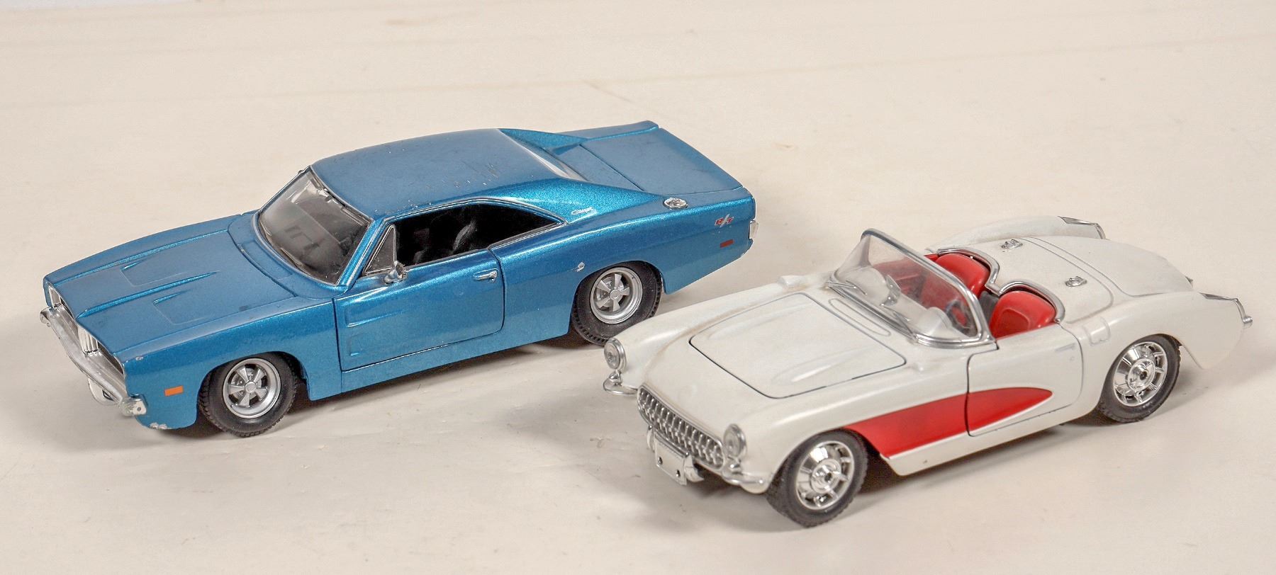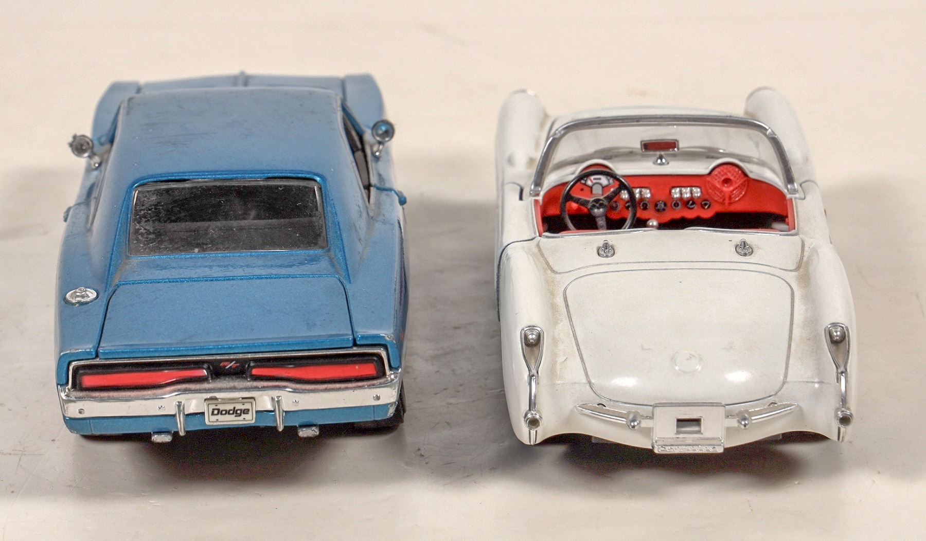 A group of eight toy muscle cars including from Muscle brand "The 25th Anniversary of Animal House" 1961 Corvette in 1/18 scale. There's also a 1/18 scale 1969 Chevy Camaro Z28 and a 1/18 scale 1957 Corvette. There are a few other toy vehicles with this package. All appear to be in nice condition. Please see photos for more details. 10-12” L ea.