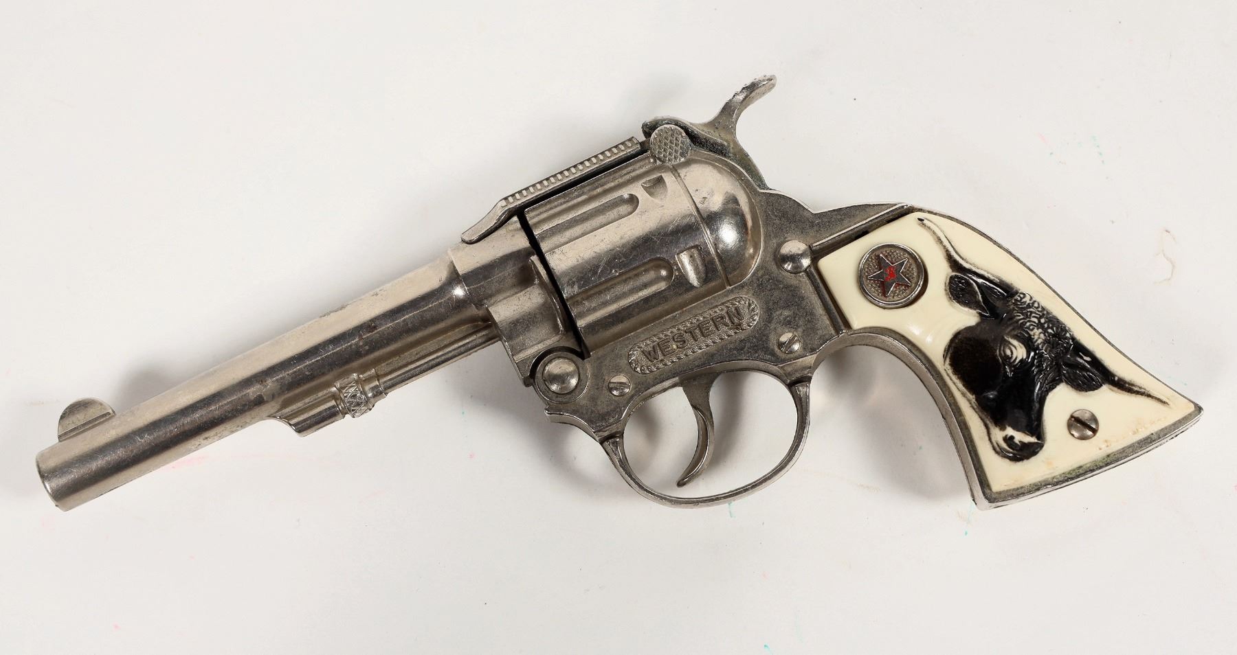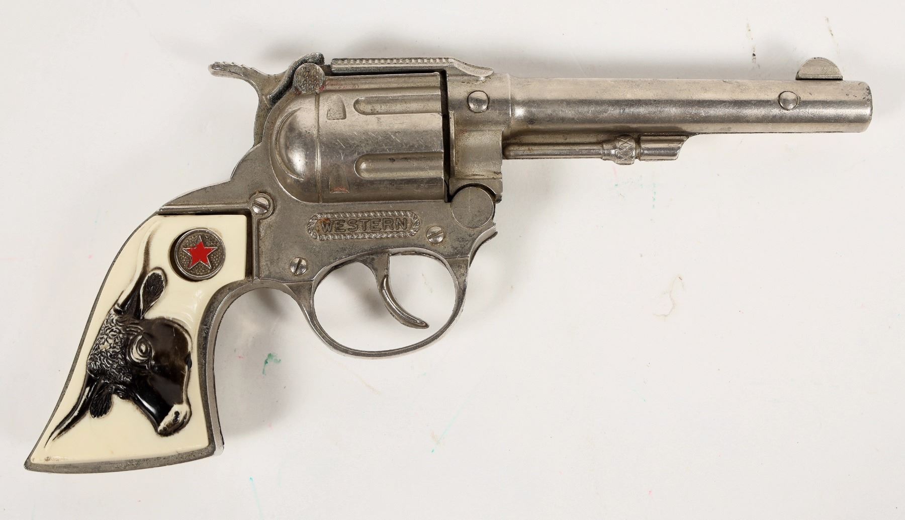 This toy pistol is a "Hubley/ Western". A working cap gun resembling the Colt Peacemaker. Please see photo for details. Please see photo for details.