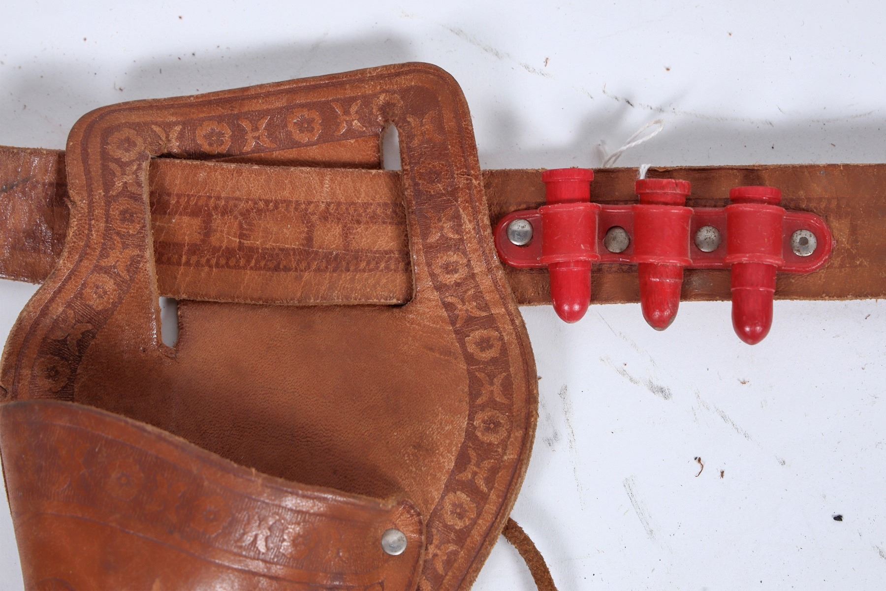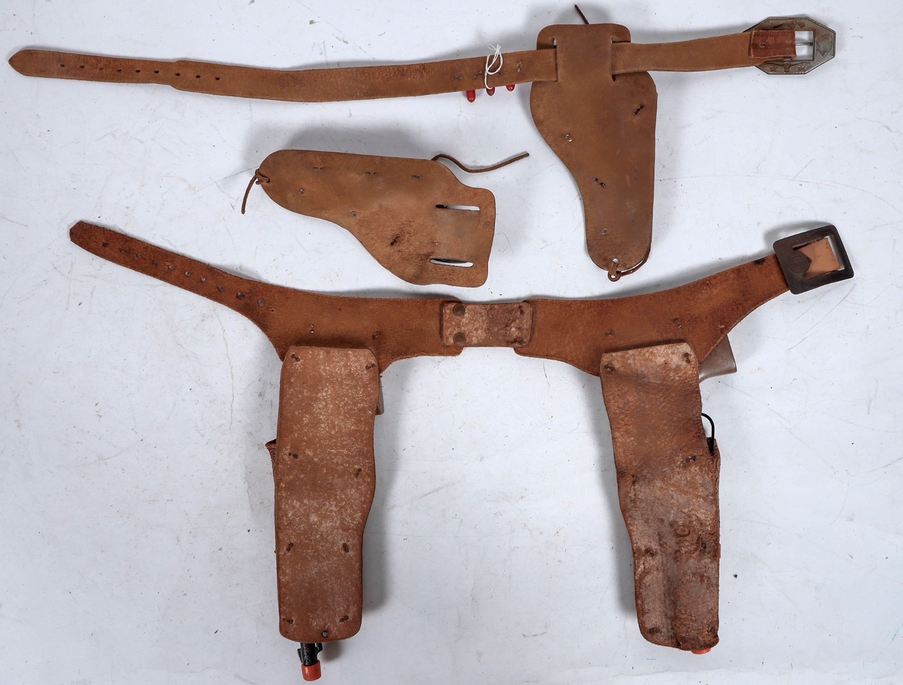 Two toy pistol setups: A more modern, post-1950 toy pistol/holster pair with six plastic "bullets" on the belt. Brown Plastic gun handles.