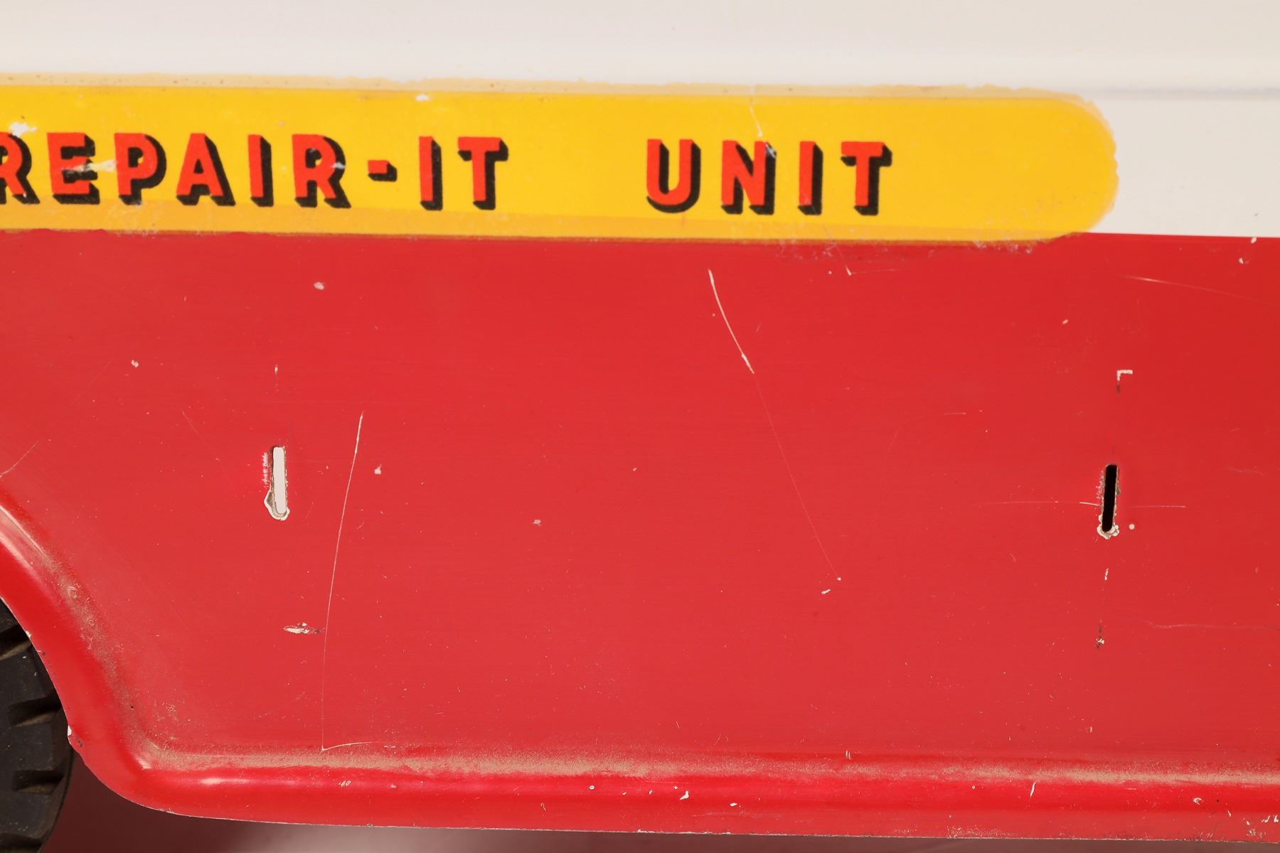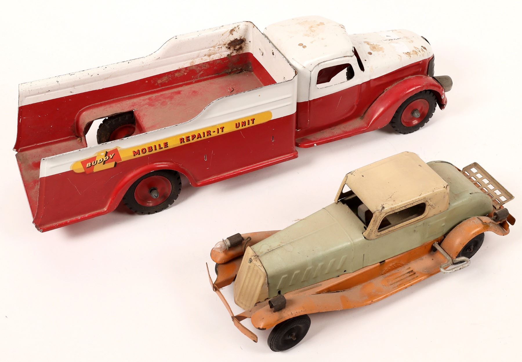 Tin toys (2), one from the 1930s, one from the 1950's. First, we have a "Buddy" Mobile Repair-It Unit. It measure 24" and the paint is in decent shape. It is missing its towing unit and tool box. Next, we have a Marx 1932 Pierce Arrow windup model (Mechanism needs repair). It measures 15" and the paint is in okay shape. This is a rare item. Please see photos for more detail.