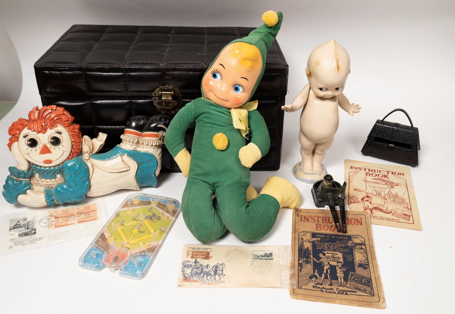 Metalcraft Corp. illustrated instruction books for model planes, 1928 and 1929. Bat-M-Up Jr. game. Raggety Ann wall hanging. Baby Doll, green doll. WW@ toy Army turret. Includes 9.5x11x11" padded carry case.