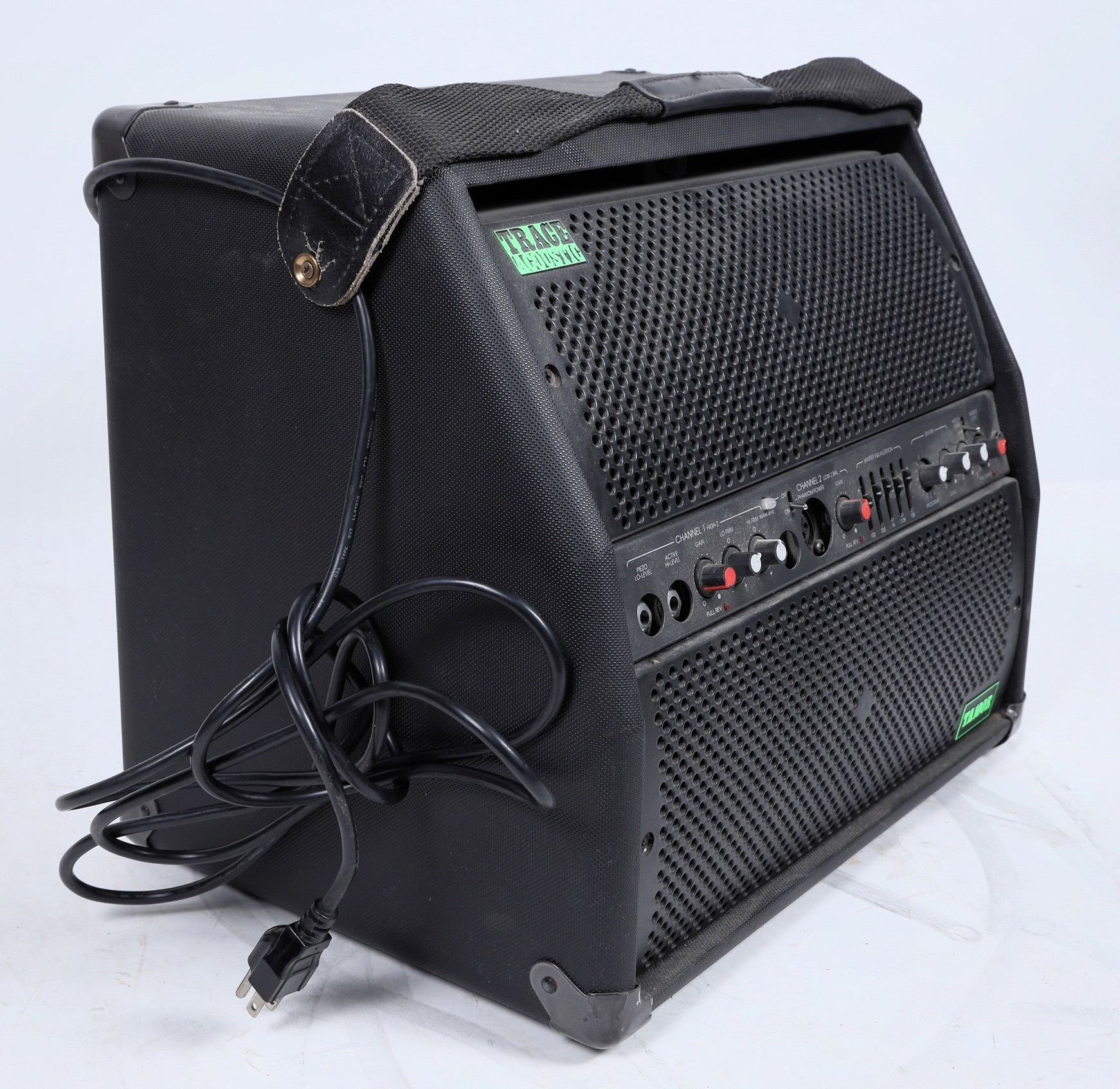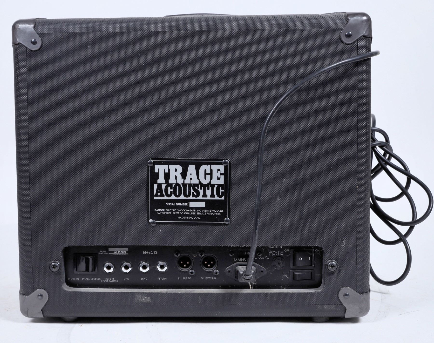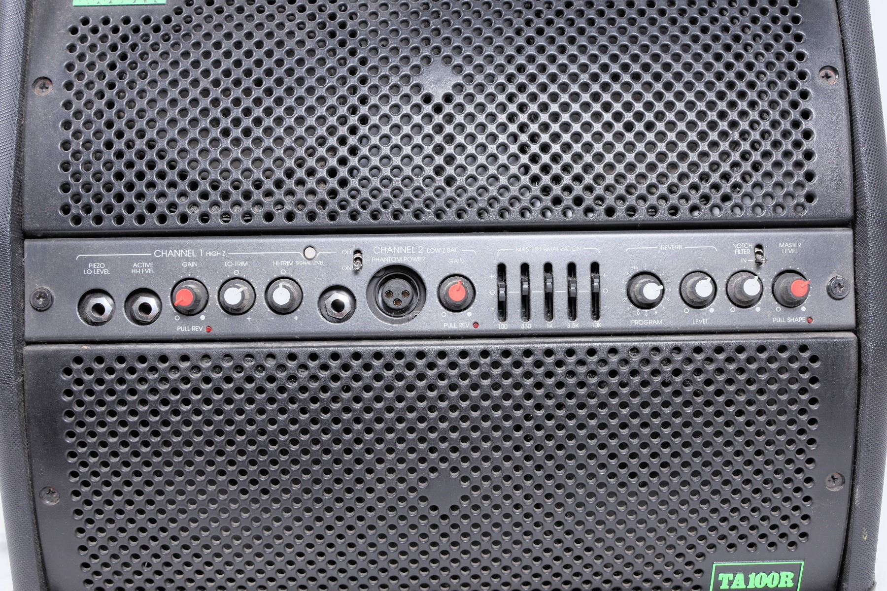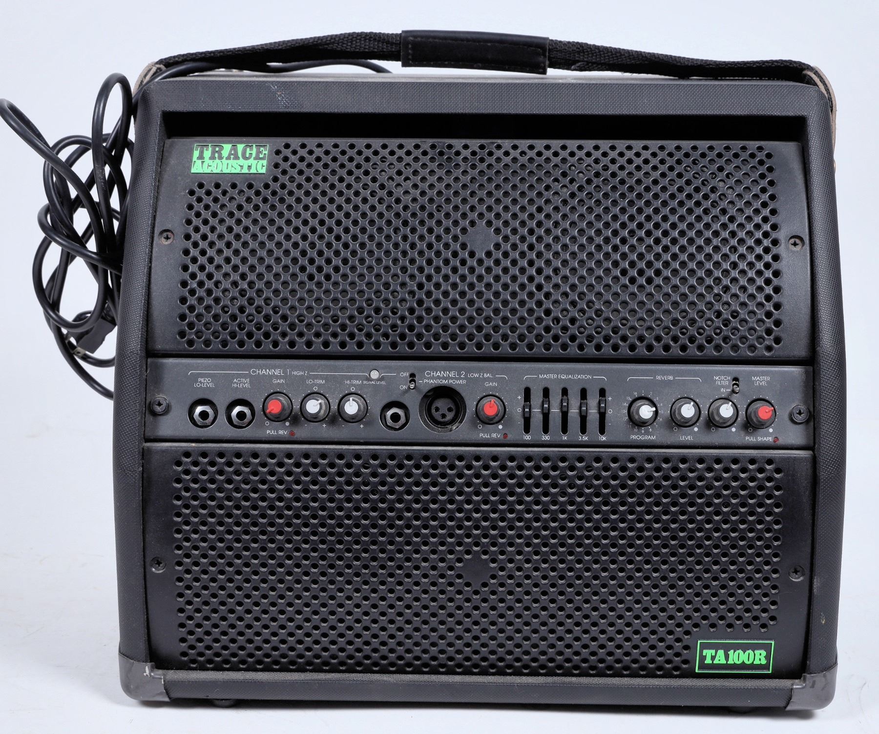 Trace Elliot TA R100 100 watt guitar amplifier and speaker. Switchable between 115v and 230v. We plugged in the amplifier and turned a few knobs and the amp produced a light scratchy sound while turning a knob, so we know the amplifier works. It is otherwise untested. Sold as is.