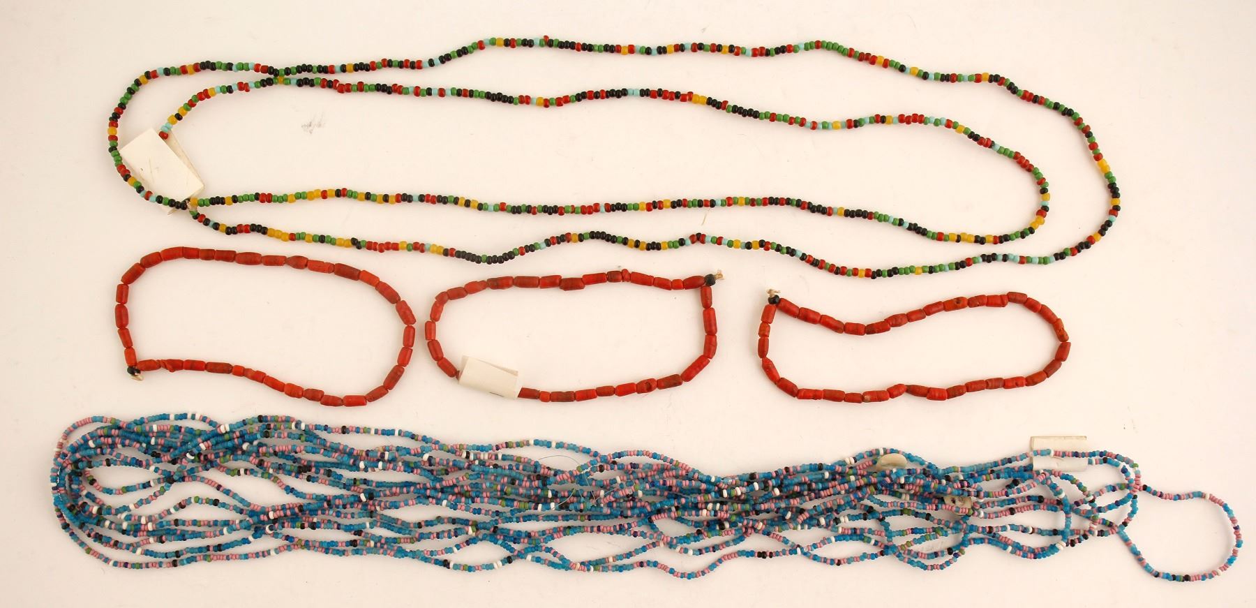 Beautiful grouping of bracelets (4 red) large strand seed beads, double strand necklace, (Paiute), and a very long strand of very small beads of pink, black, white & blue. From the Wigwam Collection of Fernley, Nevada.