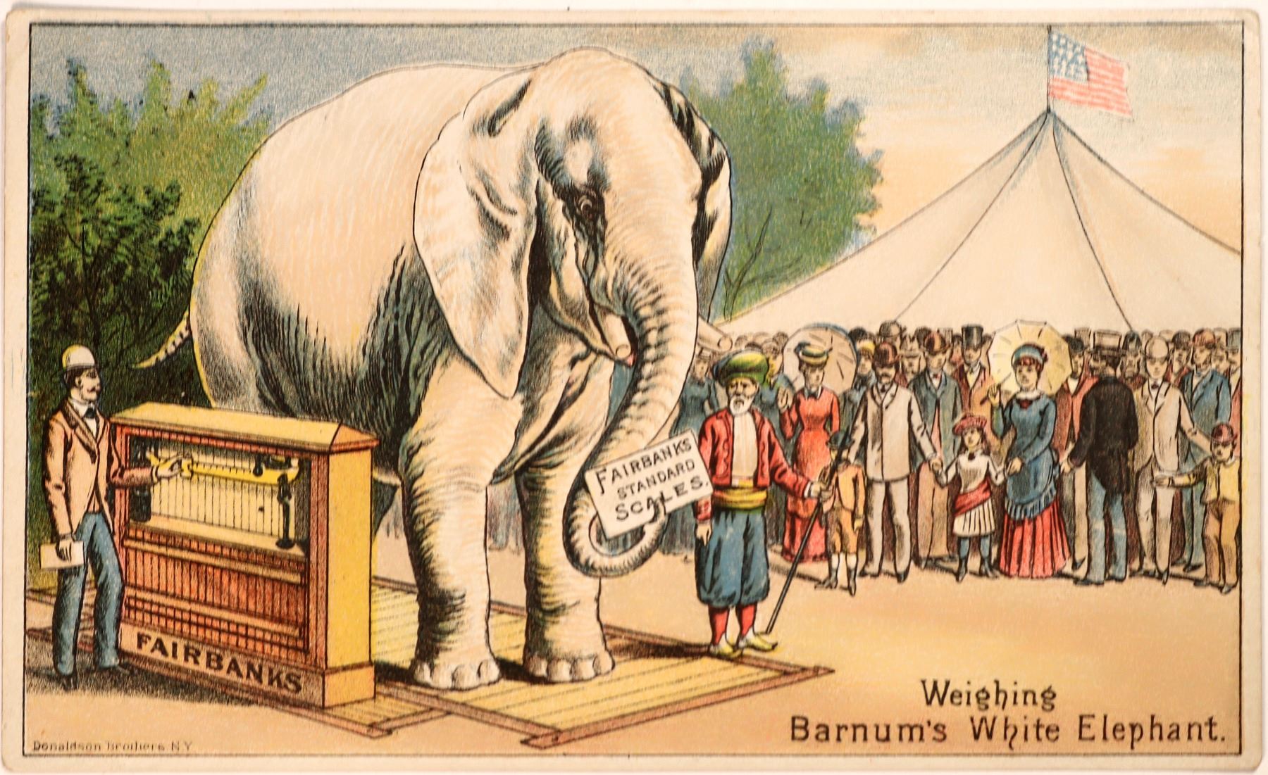 Fairbanks Standard Scale weighing P.T. Barnum's White Elephant, c1880s trade card. Rare card with illustration on front, advertisement on verso, "Barker, Dounce, Rose & Co.,/-Wholesale Dealers In-/Heavy & Shelf Hardware,/ Fairbank's Scales,/Glass, Paints, Oils,/Carriage Goods, Etc.,/Cor. Lake & Water Streets, - Elmira, N.Y. About 5" x 3". [Elmira New York