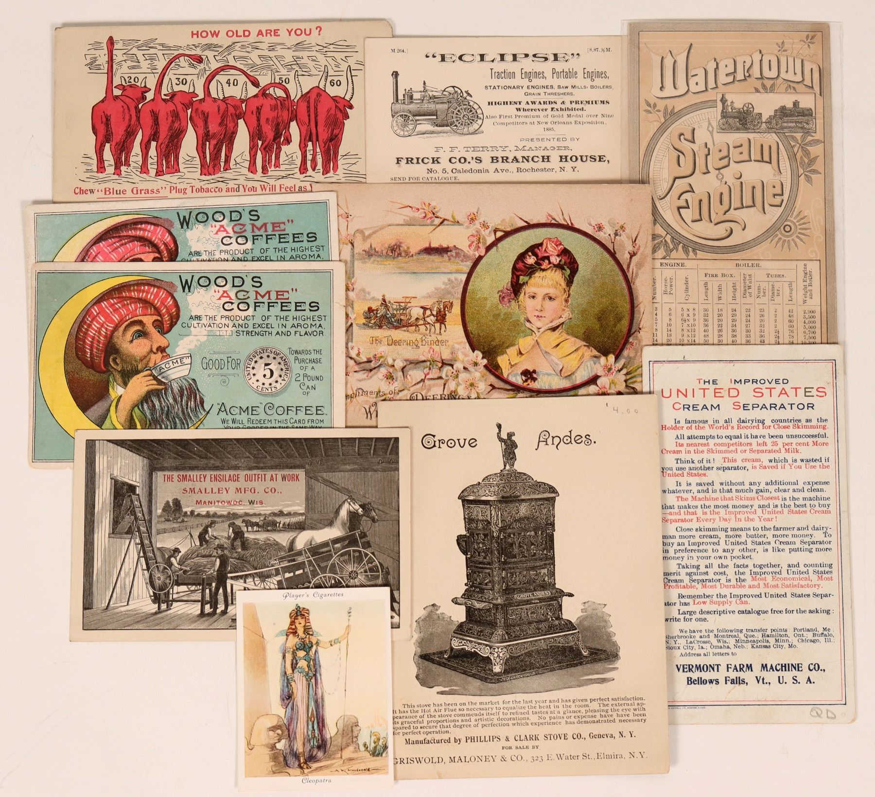 Lot of 10 trade cards includes one from Watertown Steam Engine, one showing the "Eclipse" traction engines from Frick Co.'s Branch House, Rochester, N.Y. Also, a humorous one advertising "Blue Grass" Plug Tobacco with the mentioned cows showing their posteriors. Two from Wood's "ACME" Coffees and a fancy card from William Deering & Co., Grain & Grass Cutting Machinery, Chicago are also good ones. View photos to inspect.