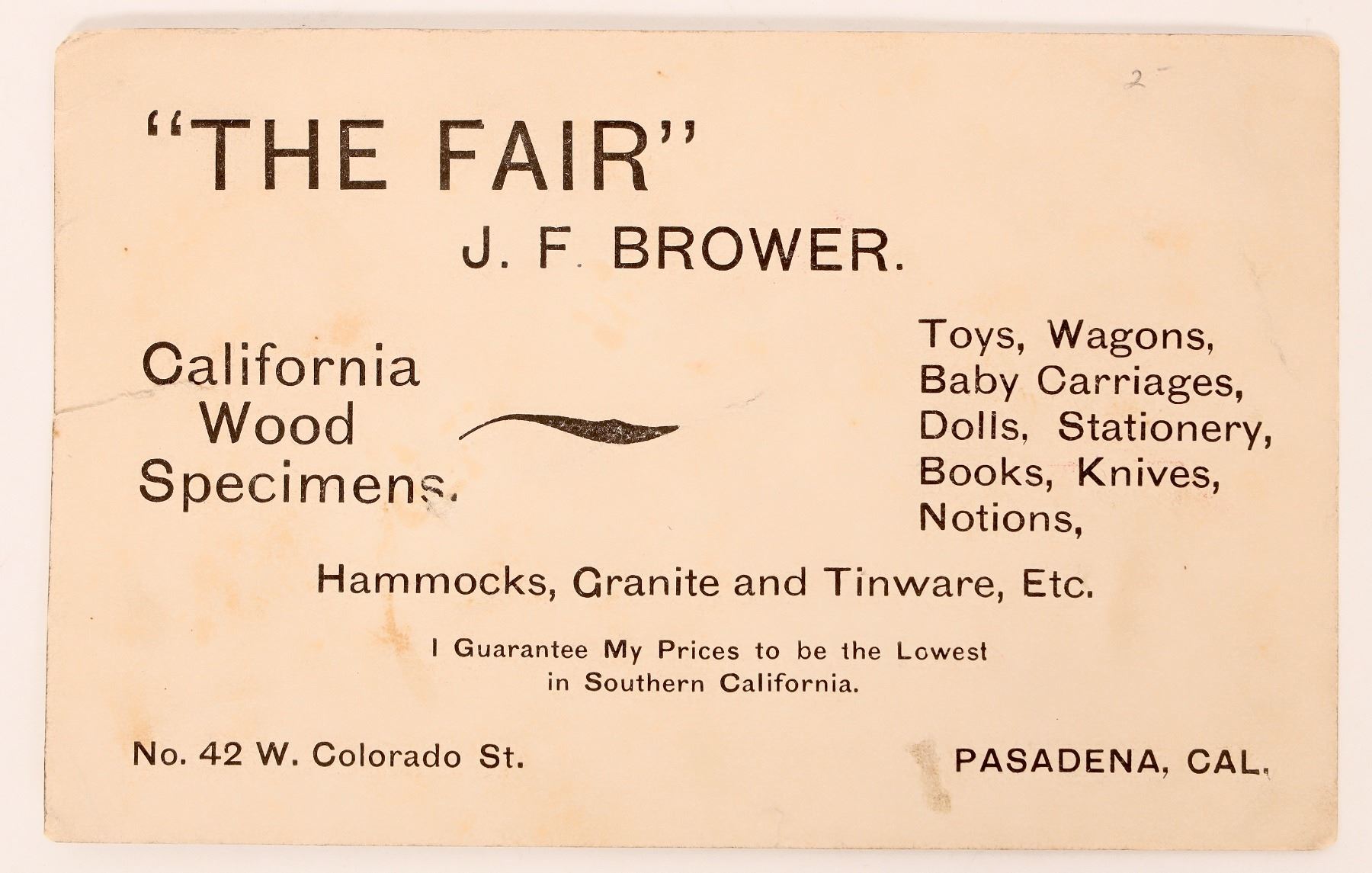 J. F. Brower offered California Wood Specimens at No. 42 W. Colorado Street, Pasadena. Five cheerful infants photos turn to grumpy old men when inverted. Clever! [