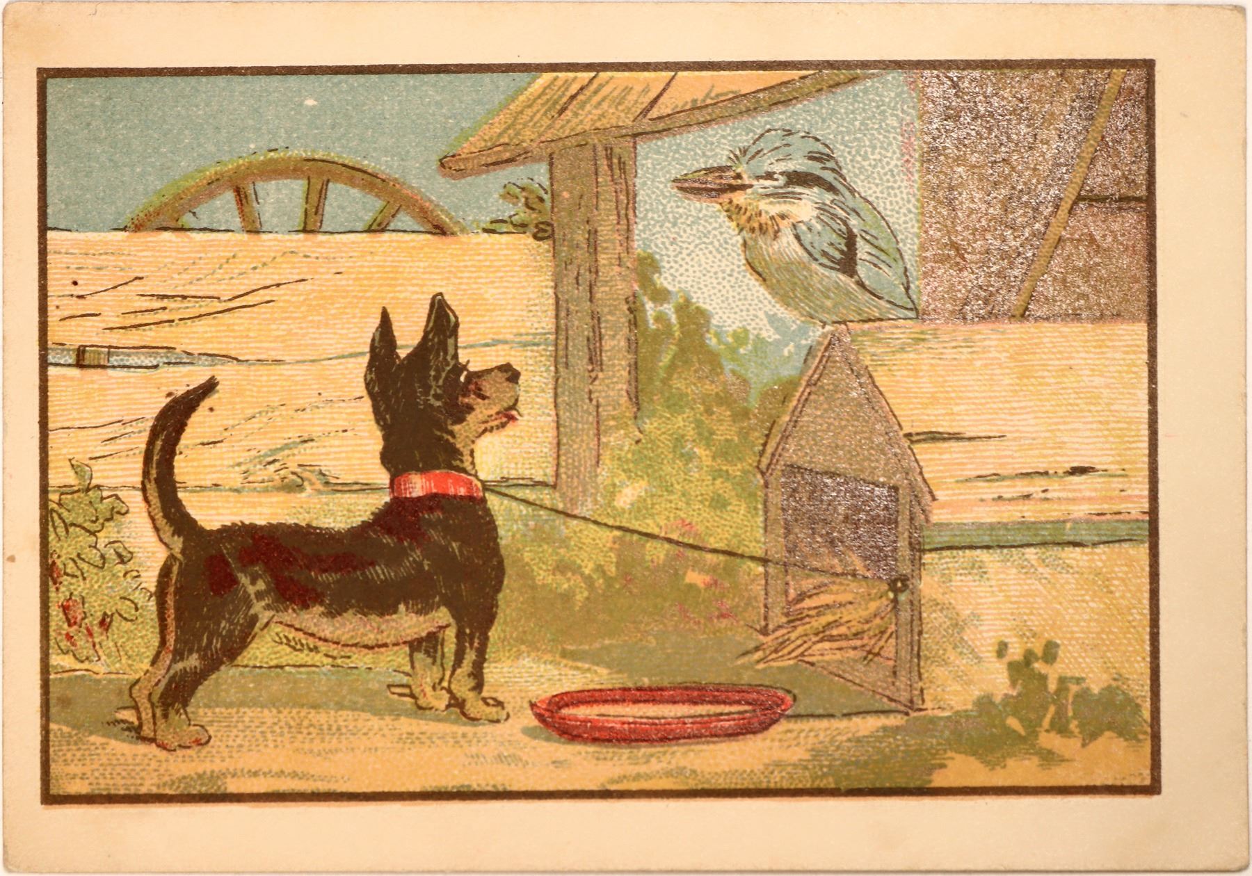 A trade card for "Market Square Dining Hall & Sample Rooms, 448 East Water St., Milwaukee, Wis." "E.J. Barlow, proprietor... Meals at all Hours." Illustration on front of a dog & blue jay. 4.5" x 3". [Milwaukee Wisconsin