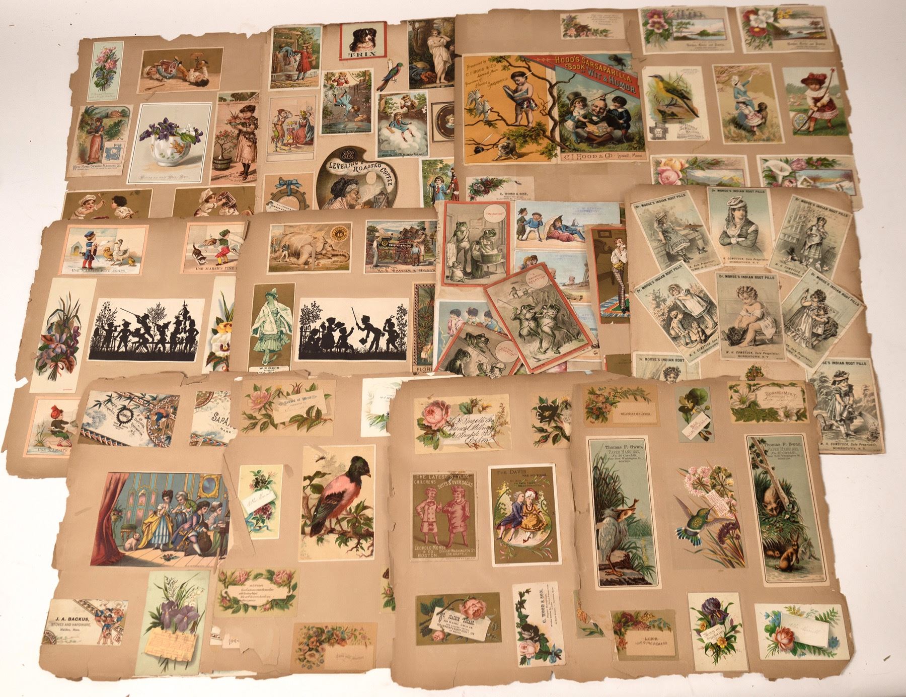 About 75 trade cards in scrap book layout. Acme Soap, shaving, children, Hood's Sarsaparilla, frogs, sewing machines, mustard and more. Nice group.