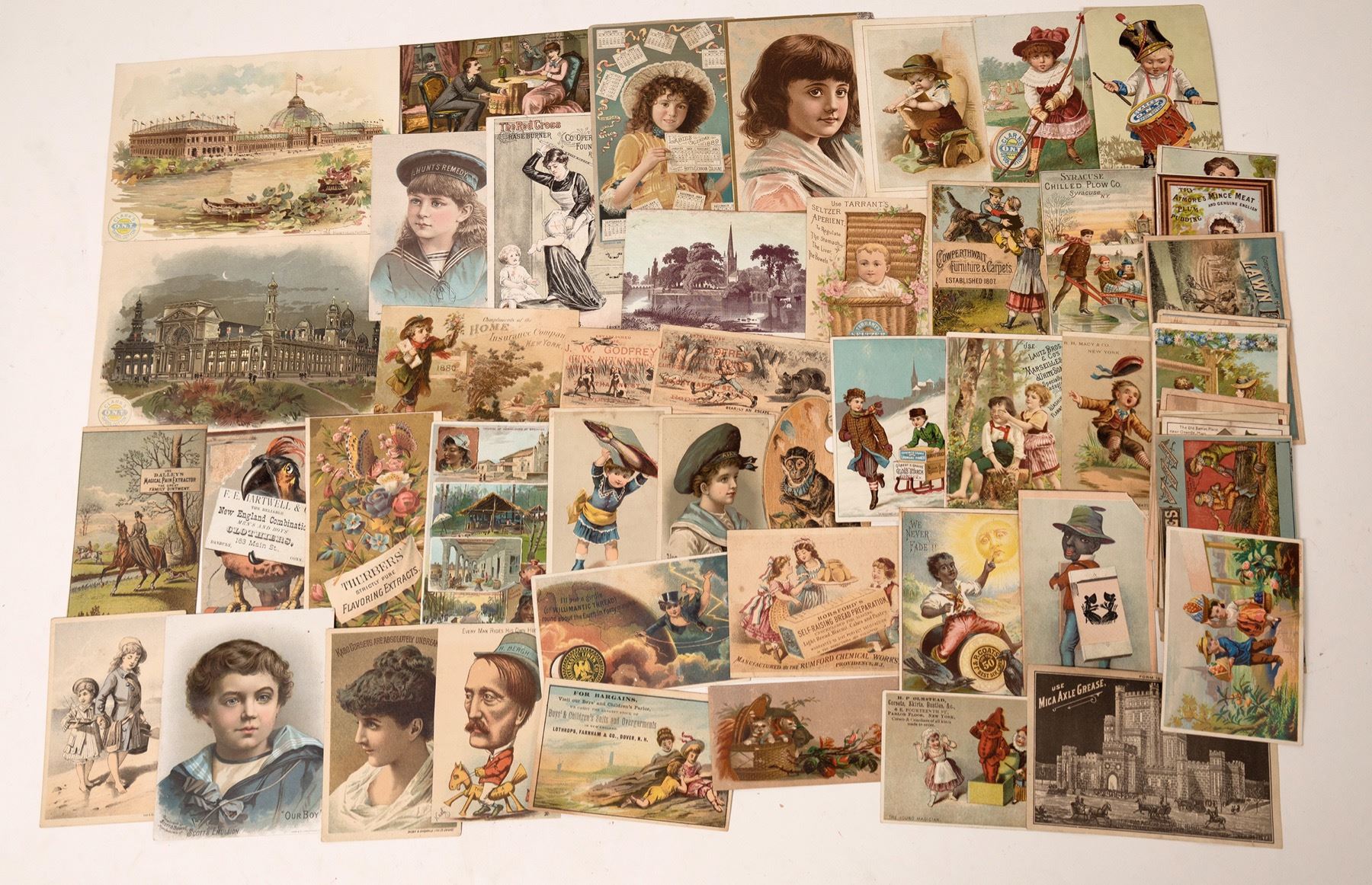 About 40 trade cards. Medicine, shoes, insurance, starch, corsets, cotton, lawn mower. 3 gun dealers, large Columbian expo.