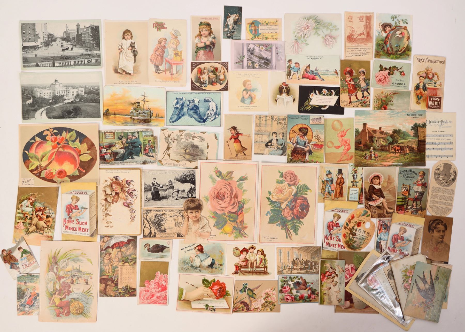 A fantastic lot of 70-plus chromo-lith trade cards c1870s-80s. All different, wide variety of shapes and sizes. Includes trade cards, cut outs and die cuts. Great illustrations, can be used for interior design, etc. Please see photo(s) for more details.