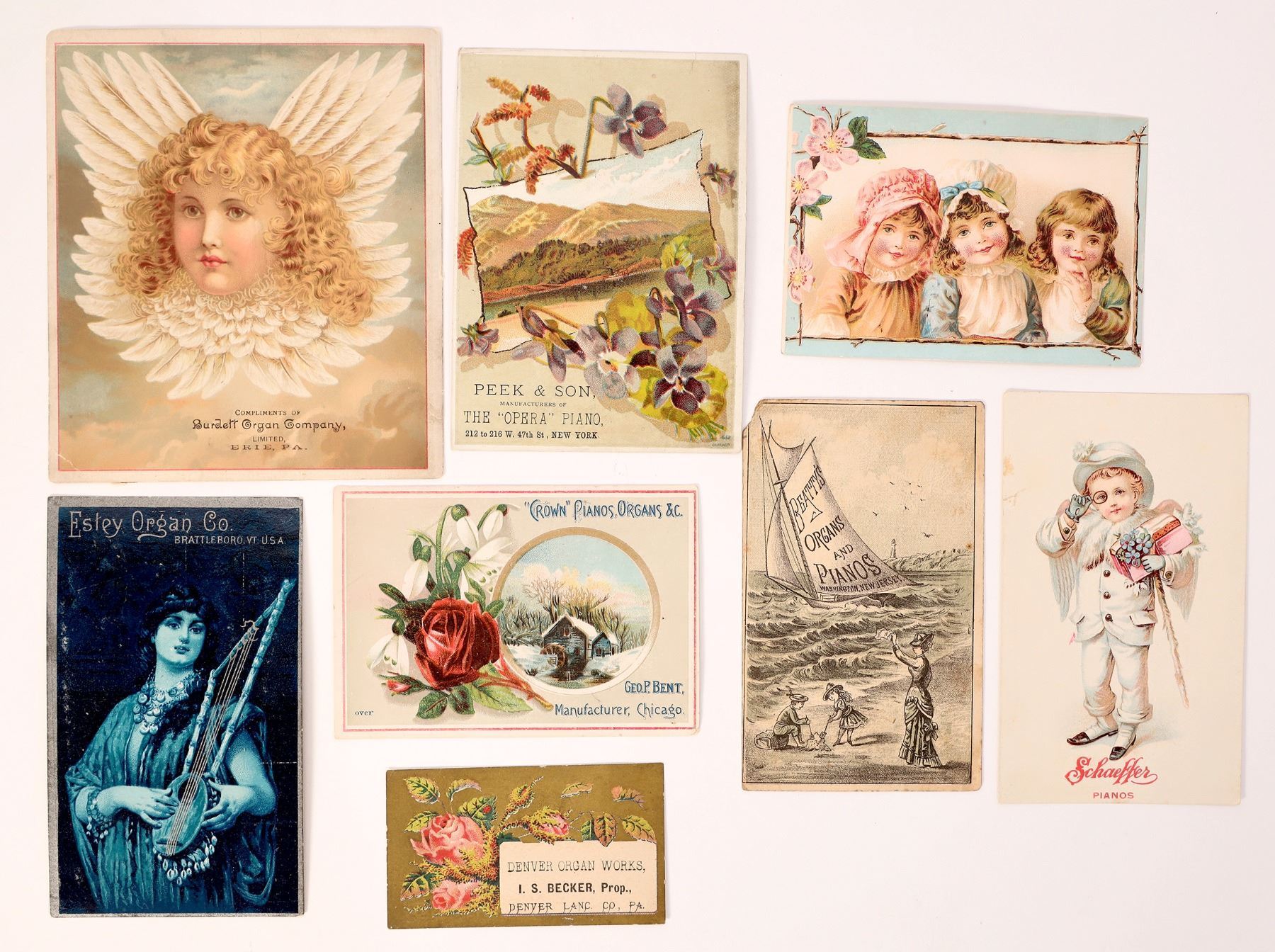 A collection of 8 trade cards advertising musical instruments and music stores, c1880s-90s. Chromo-liths. Schaeffer Pianos, Traverse City, Mich.; Denver Organ Works, Denver Lanc. Co., Pa.; Richmond Piano, G.M. Ott & Bro., Akron, Ohio; L.N. Tinkham, Sylvania, Pa.; Beatty's Organs and Pianos, Washington, N.J.; Burdett Organ Co., Brie, Pa.; Estey Organ Co., Brattleboro, Vt.; and Peek & Son, New York.
