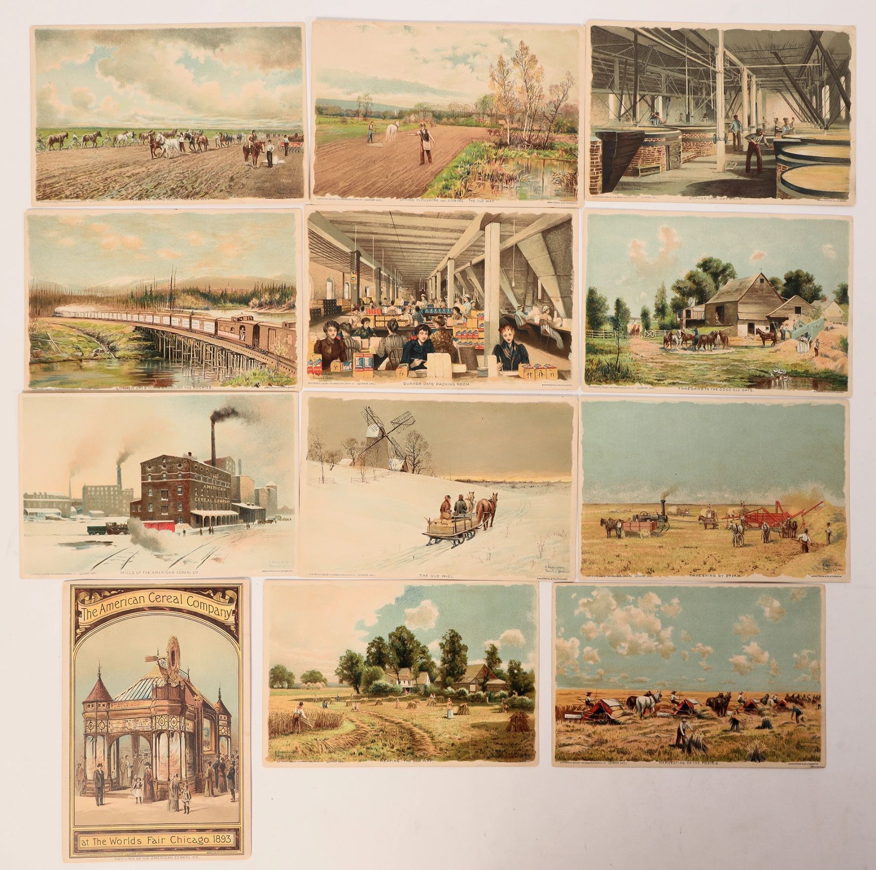 RARE complete set of 12 Quaker Oats/American Cereal Co. trade cards, copyright 1893. Chromo-lith. Illustrations of the process of oat production, from ploughing fields to steam train delivery, by artists H. Bolton Jones and Frances C. Jones. Also an illustration of the American Cereal Co. pavilion at the World's Fair Chicago, 1893. Pub. Armstrong & Co., Boston. 5" x 7.5".