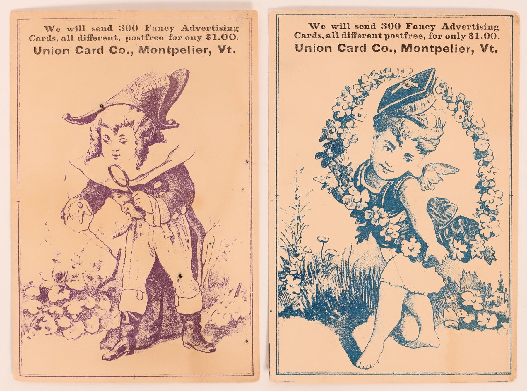 Two advertising cards from the Union Card Company of Montpelier, Vermont offering 300 fancy advertising cards, all different for only $1.00. 3 x 4 1/2 inches. [