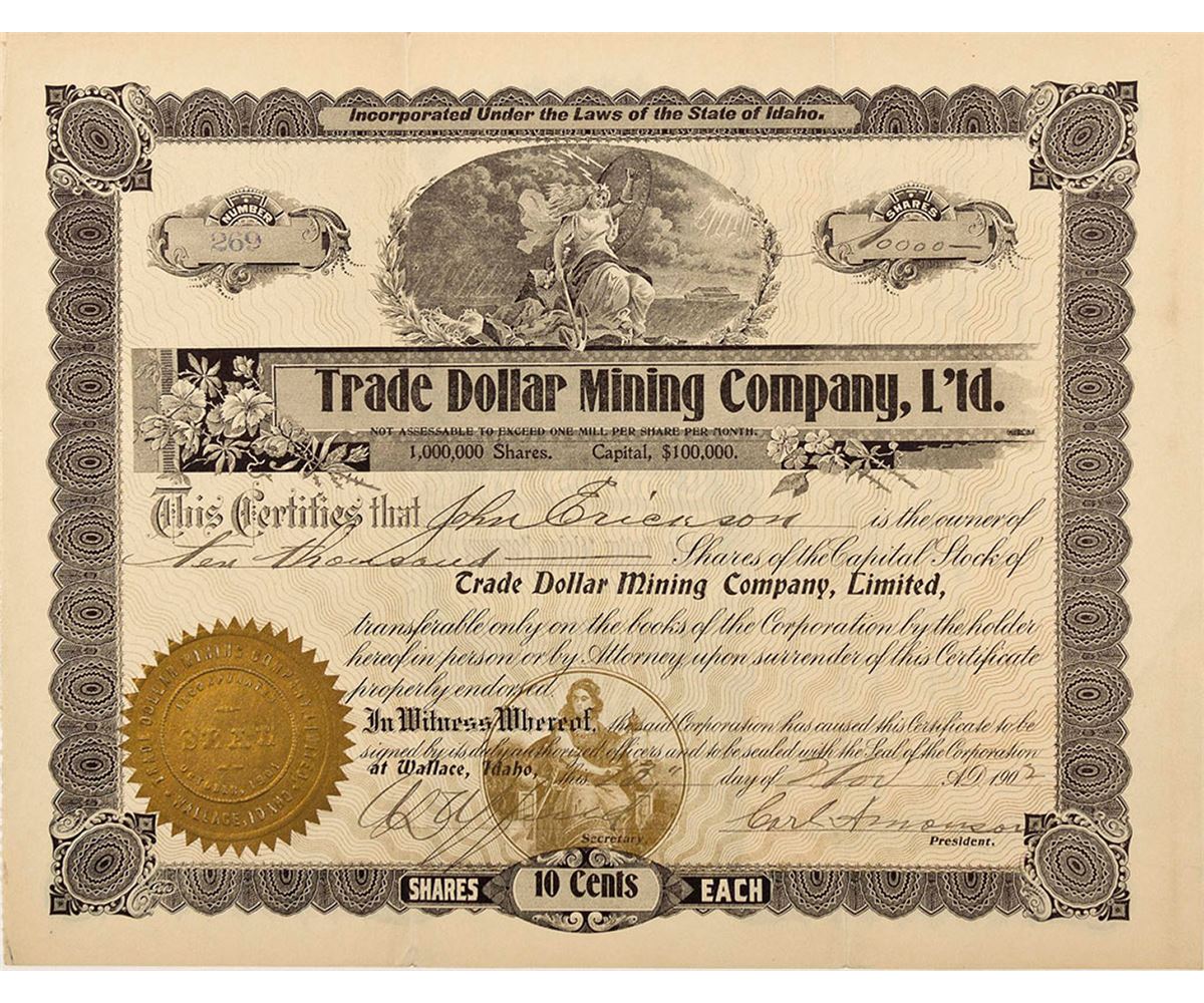 Stock measures 10 ½”x 8 ¼” Incorporated under the laws of the state of Idaho. Stock number 269 issued to John Ericson for 10,000 shares on November 13, 1902. Signed by Secretary name illegible and President Carl Amonson. Vignette of a woman with a shield and anchor sitting on rocks with an ocean in the background. Black border and black print. Gold embossed seal in the lower left corner and gold safely print. Little wear, two creases present down the stock. U/C.