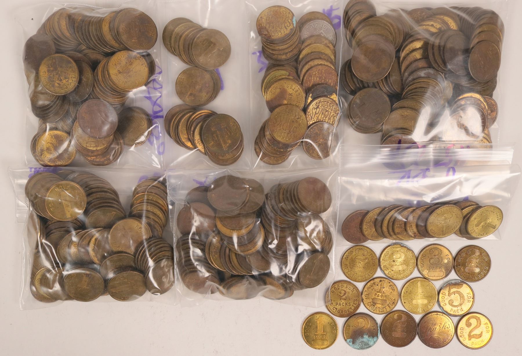 Over 300 tokens good for one, two, three or five packs of cigarettes. Many for the "Sparks" brand. Trade stimulators were gambling machines used in saloons and businesses from the late 1800s through the 1950s.