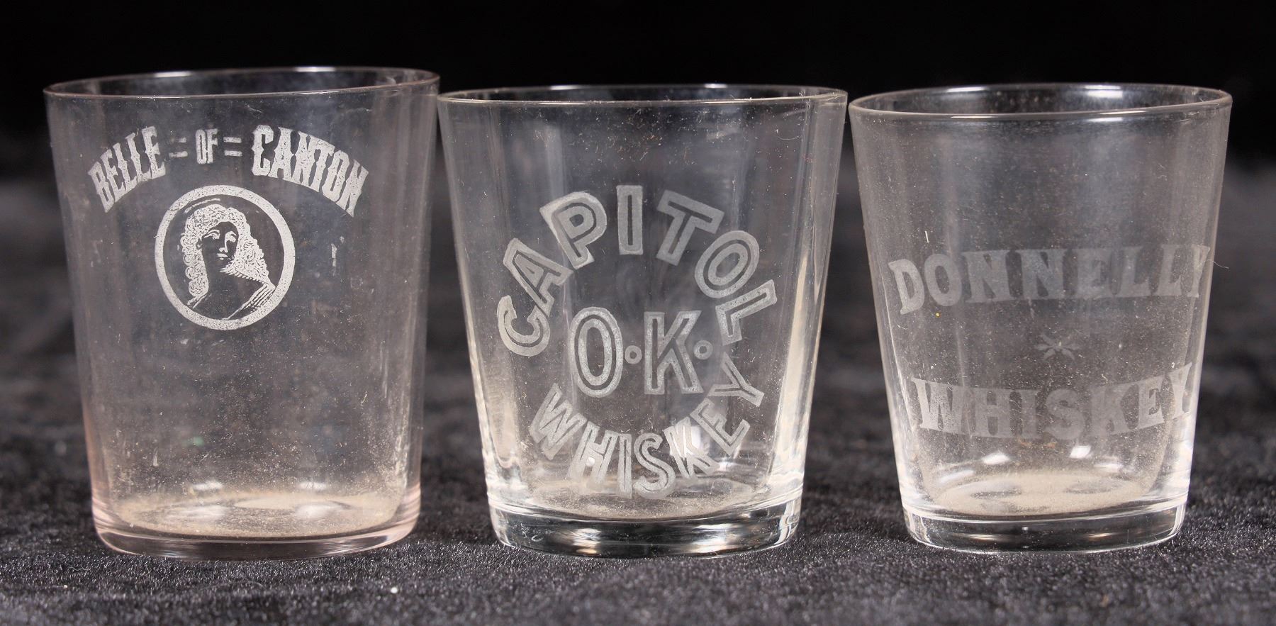 Donnelly Whiskey, Capitol O K Whiskey, Belle of Canton. No apparent chips or cracks.