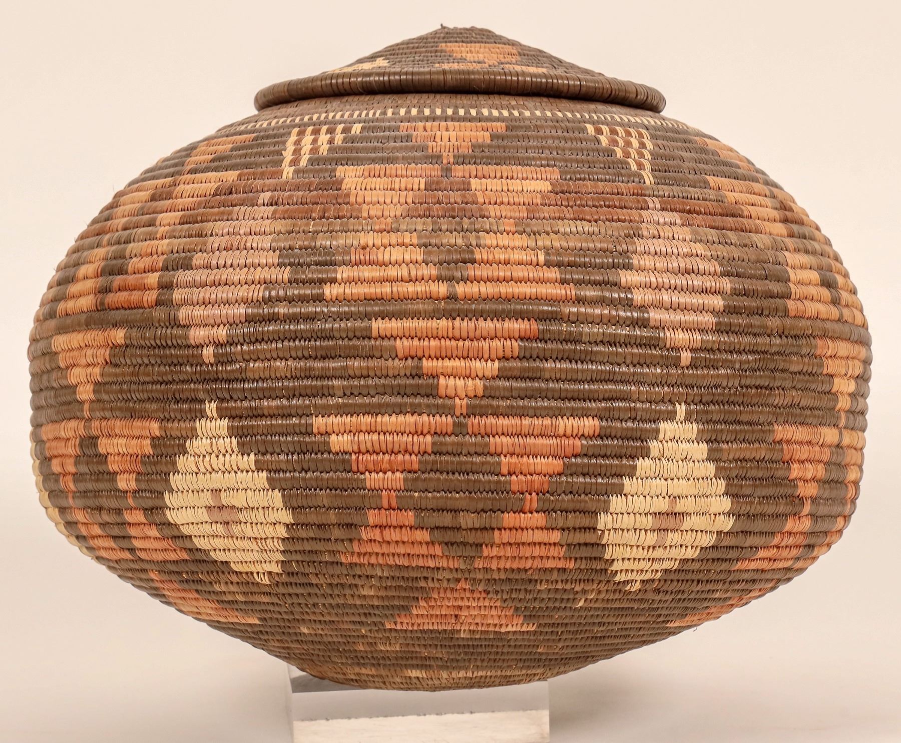 Coiled basket with lid, probably African--no info available from collector. Approx. 12-14" diameter. Lid is missing top knob, otherwise very good condition.