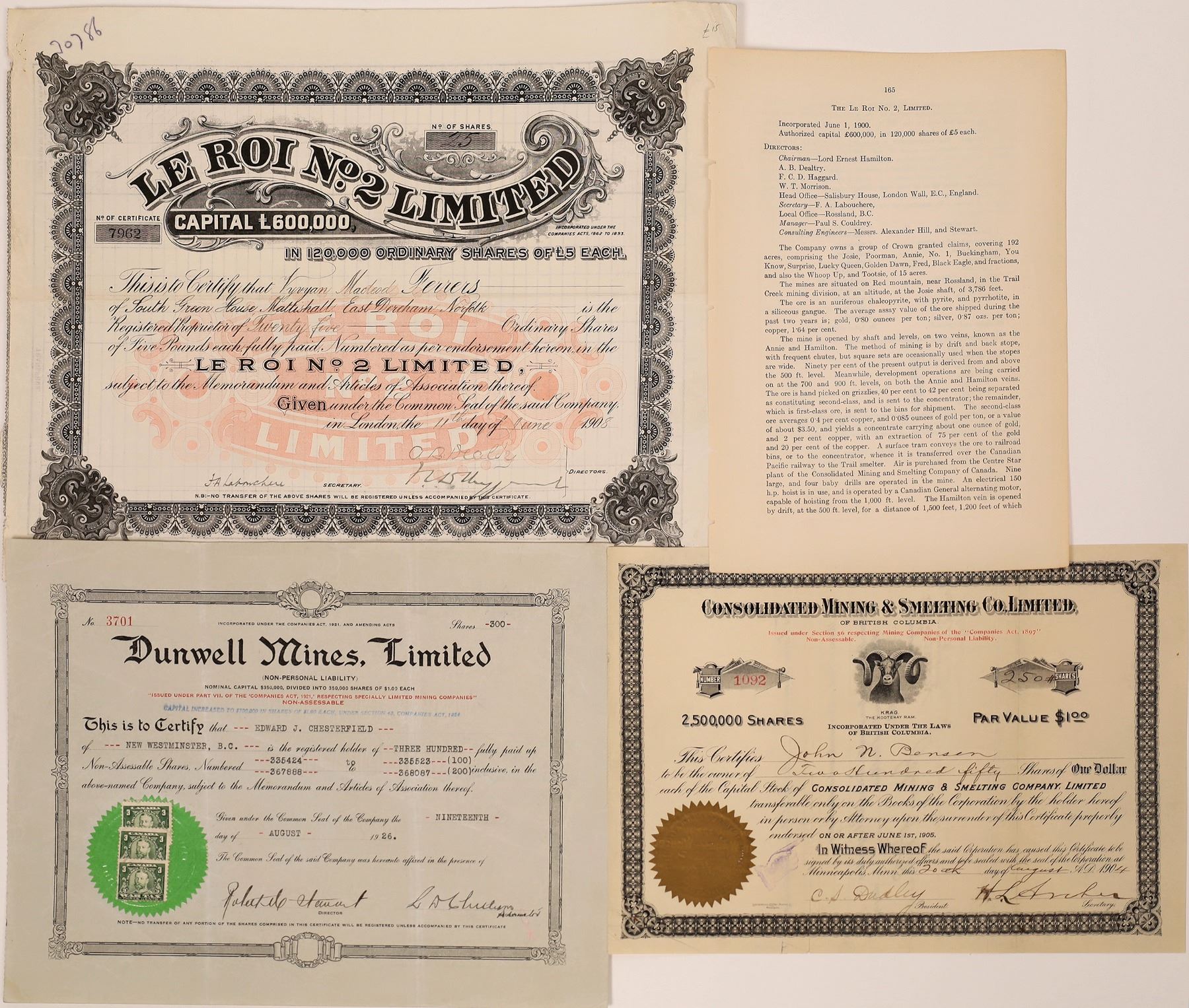 Lot of three. 1) Le Roi #2 Limited. Issued to Ferrers. He was most known in history for his occupation of the Channel Islands. Nice pink underprint. 2) Consolidated Mining & Smelting. Dated 1904. Great mountain sheep vignette. 3) Dunwell Mines. 1926. Three Canadian 3c war tax stamps.
