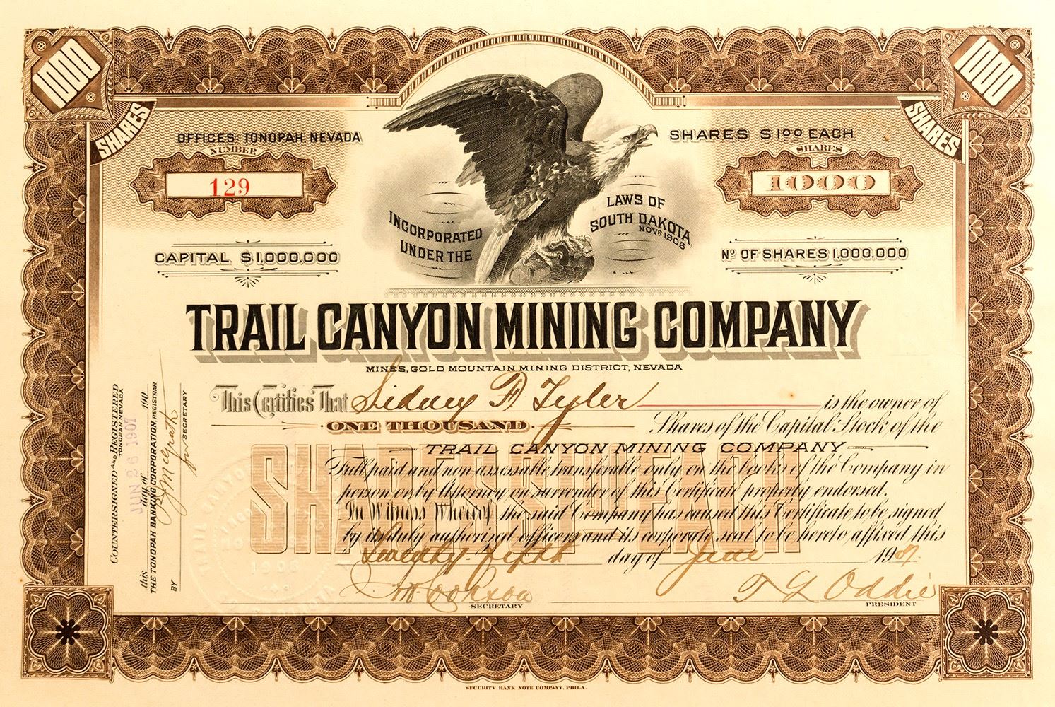 Certificate #129 from the Trail Canyon Mining Company issued in 1907 for 100 shares to Sidney F. Tyler and signed by T.L.(Tasker) Oddie as president. Inc. in South Dakota. Offices, Tonopah, Nevada. Although the certificate states the mines were located in the Gold Mountain district, in the spring of 1907 Charles M. Schwab, Oddie, and F. J Leutjens expanded the assets of the company by purchasing five promising claims in Trail Canyon whose assays were running from $50 to $3,000 per ton. Trail Canyon is located southwest of Furnace Creek on the eastern flank of the Panamint Mountains near Wildrose and Skidoo. The New York stock market collapse in 1907 spread west and caused two Goldfield banks to close. Five Oddie backed companies failed, including this one when Oddie could not make good his obligations to the shareholders or the Tonopah Banking Corporation, which had invested in his development work (Loren Briggs Chan, Sagebrush Statesman: Tasker L. Oddie of Nevada 1973). Nice clear signature from Oddie as president. Security Bank Note Company, Phila. Printer. Uncancelled. VF. City: Death Valley State: Nevada Date: HWAC# 51241