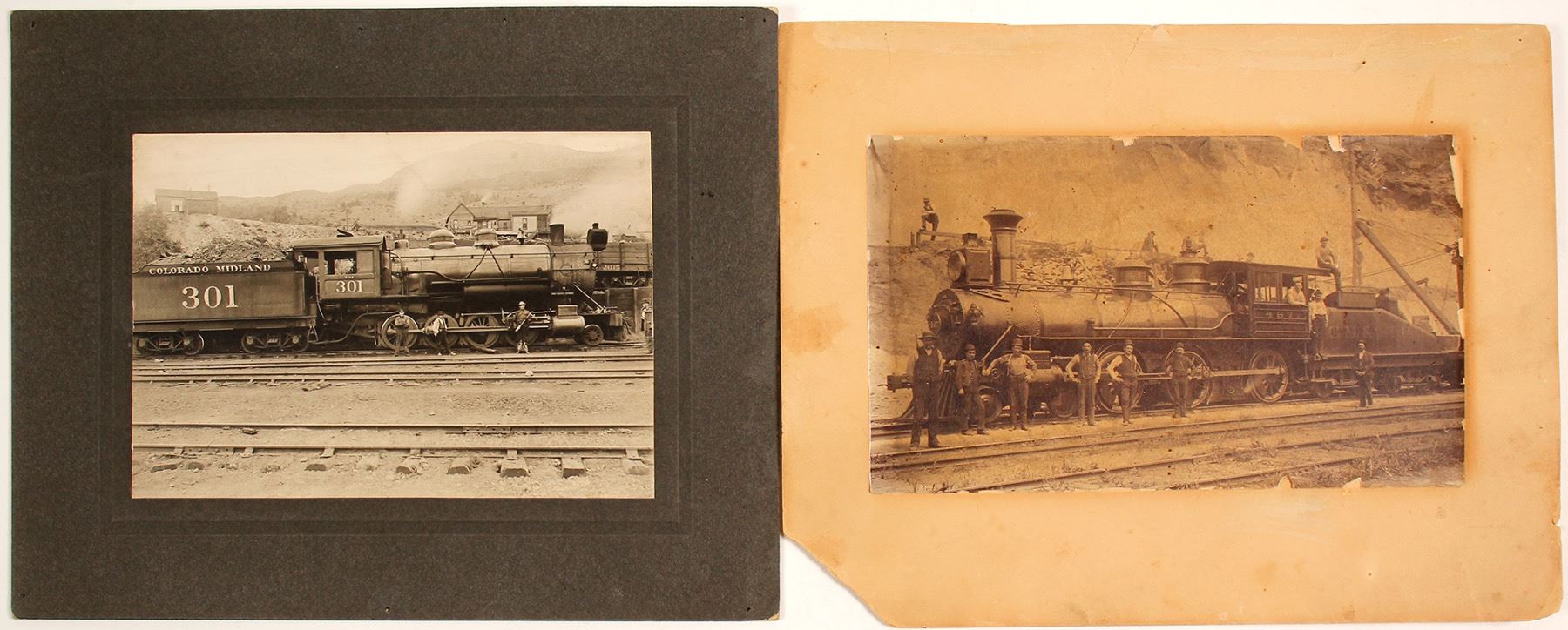 Train Engine No. 301 (Colorado Midland) 7" x 4.75", three men standing in front of train. Train engine no. 467, appears to be 13 men standing near train. Condition issues, slight tears at edges and staining. 7.5" x 4.75". Date: 1910 Location: Colorado HWAC# 56752