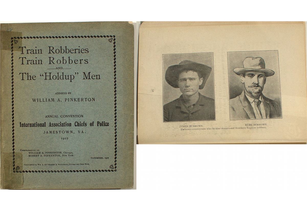 Booklet. Address by William A. Pinkerton at the Annual Convention, International Association Chiefs of Police. 84 Pages. 5 1/4" x 6 1/2". 42 Photographs of Holdup Men including Frank and Jesse James, the Younger Brothers and Butch Cassidy and the Sundance Kid. Tape on cover and worn bindings.otherwise nice shape.