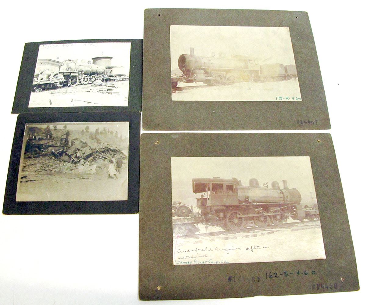 4 b/w train wreck photos. Dates unknown. 2 matted 4.5" x 6" photos of locomotives after a wreck. Matting has 2 holes and writing on both photos. Two 4" x 5" matted photos of wrecked locomotives, upper one is possibly Northern Pacific. Lower one has rear notes- Rapid Wreck 1905, worst wreck on division. 273-275. Killed Geo Vaupel, DeGroat, Jack Campbell-went into firebox. orig- Barney Basset. Date: Location: HWAC# 571421