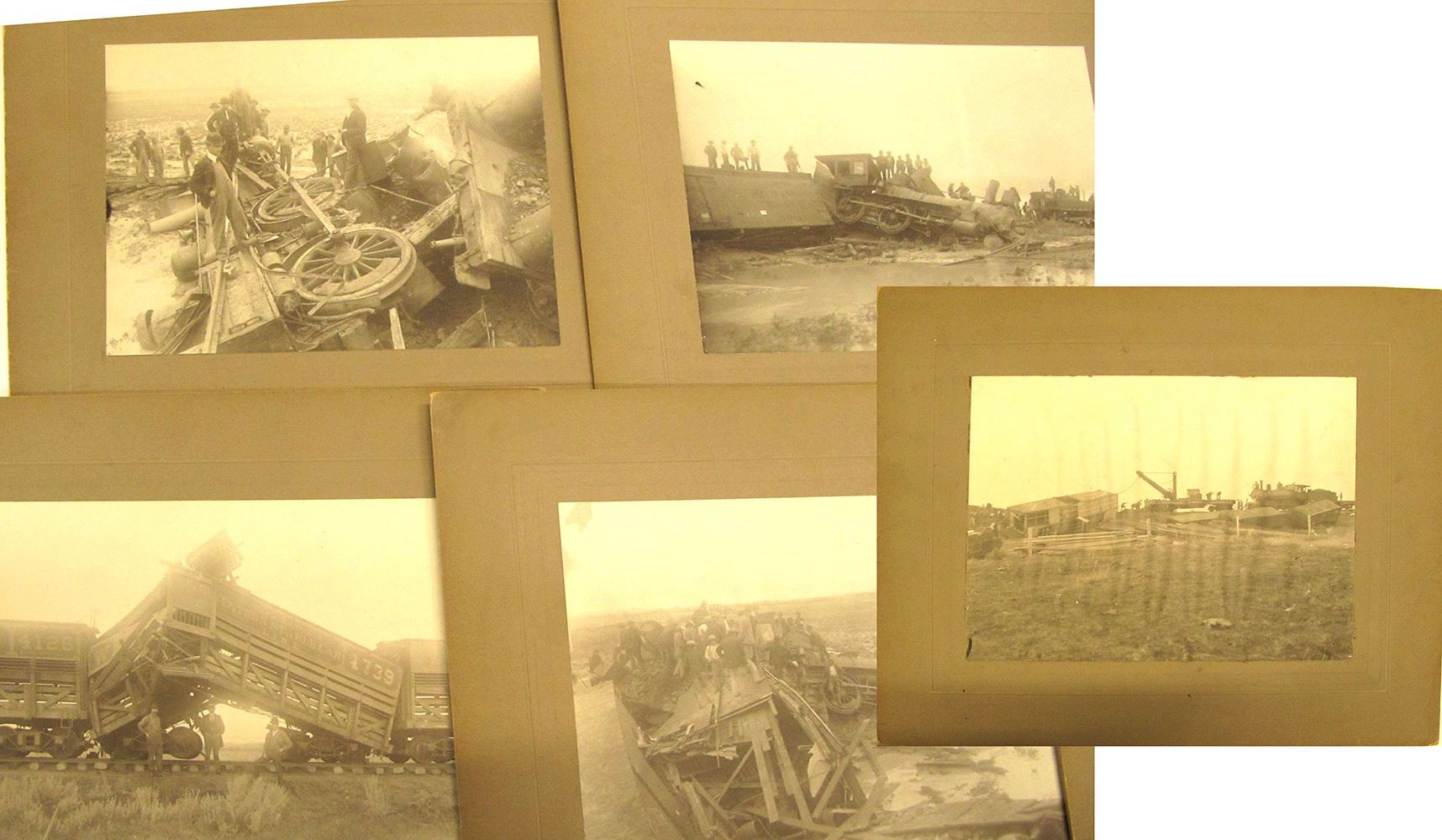 5 matted photos of train wreck with pencil writing on back reading "706-720 in washout". 1 of the matts is slightly stained. One of the photos has ripples and mark in lower left corner. One spot on upper left corner. Engine No. 532(?) wreck stopped in "washout". One of the cars reads "Union Refrigerator Transit Co. 3461". 8" x 6". Date: early 1900's Location: Colorado HWAC# 56753