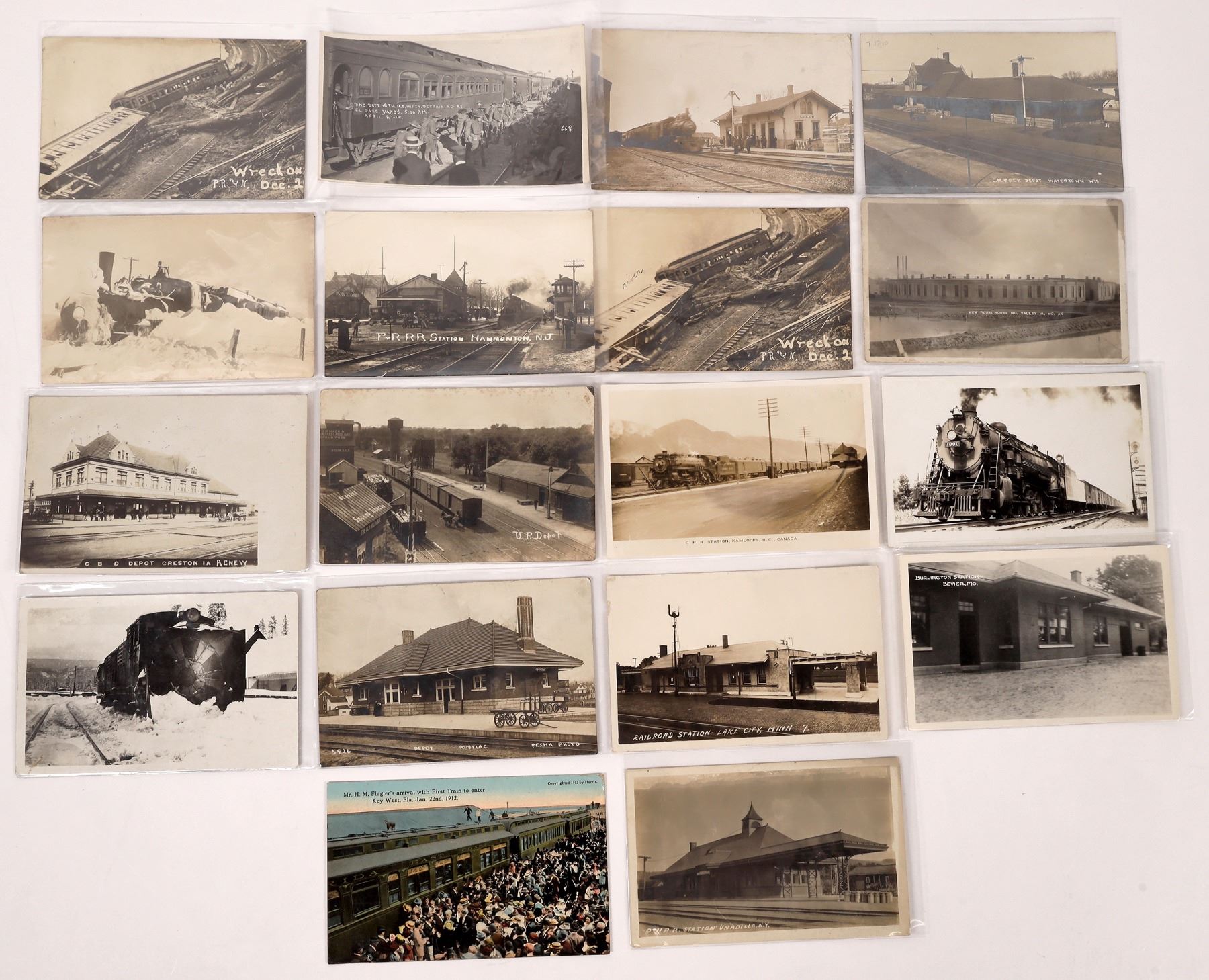 Lot of 18. One is color postcard of the First Train arriving in Key West Florida Jan 22, 1912. Remainder are RPC's of steam locos and depots. One is of North Western Passenger stuck in the snow near Oshawa, MINN Feb 1915. One of PR&N (Pacific Railway & Navigation CO.) train wreck Dec 2, 1912.