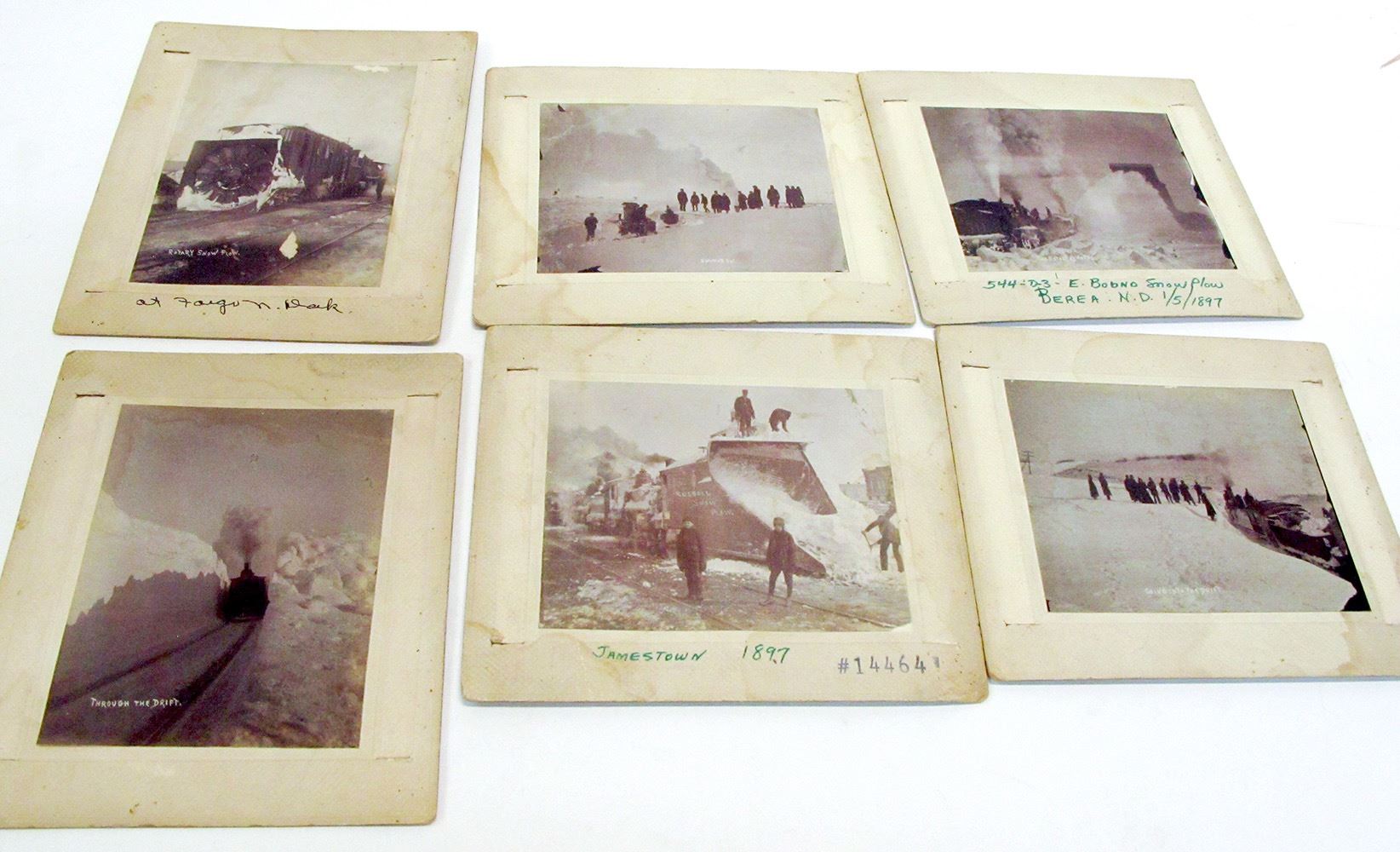 4 4.75" x 3.75" b/w photos of trains in snow. Rotary snow plow at Fargo North Dakota(2 small photo scrapes), a snowed in locomotive with many people on top of the snow, snow plow at Berea, ND 1897, 2 locomotive going into the drift. Jamestown 1897 Russell Snow Plow. Some water staining on all photos. Date: Location: North Dakota HWAC# 571422