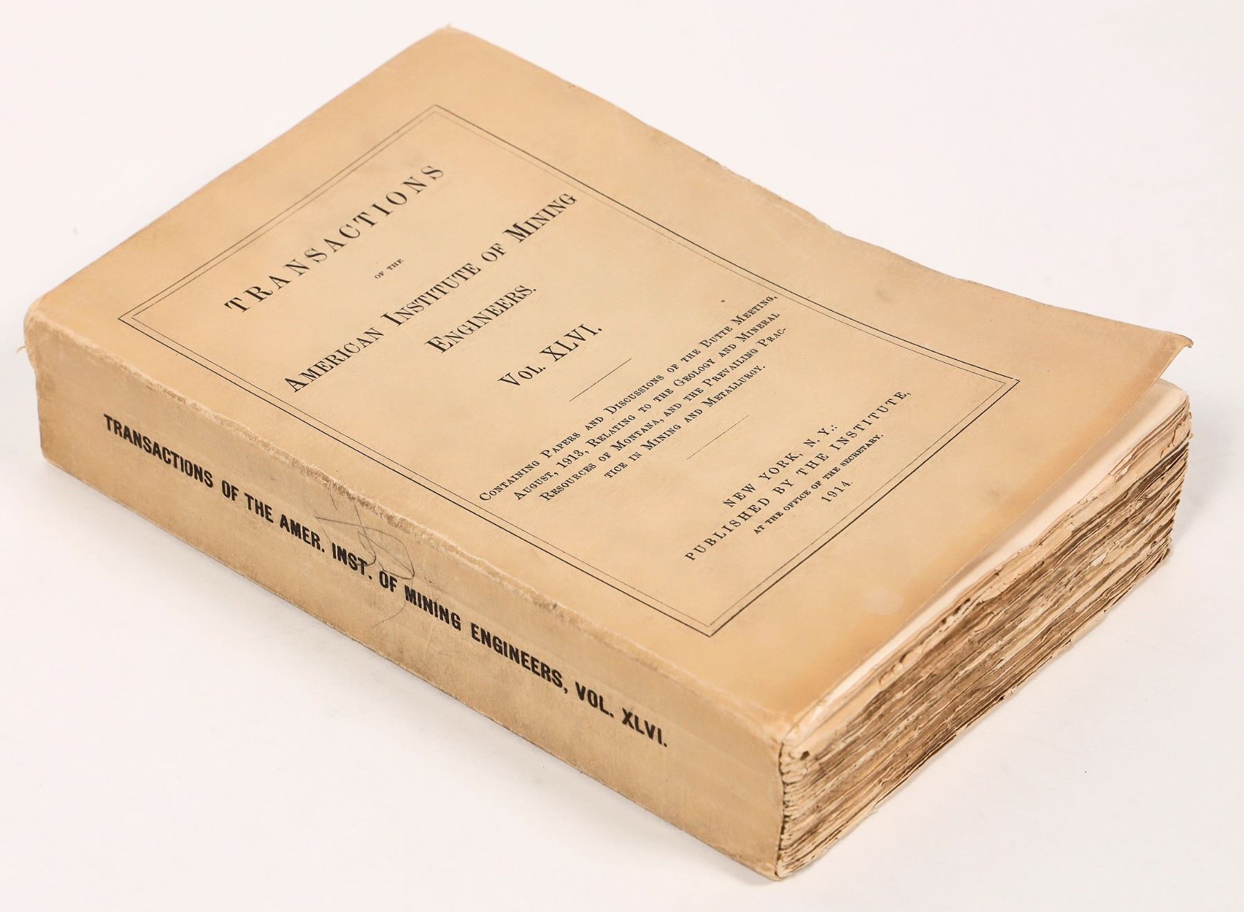 Rare 1914 Transactions of the American Institute of Mining Engineers Vol XLVI. Discussions of the Butte meeting and prevailing practices in mining and metallurgy. 970pp with index. Upper back corner pages are curved due to storage, not dog eared. Please inspect.