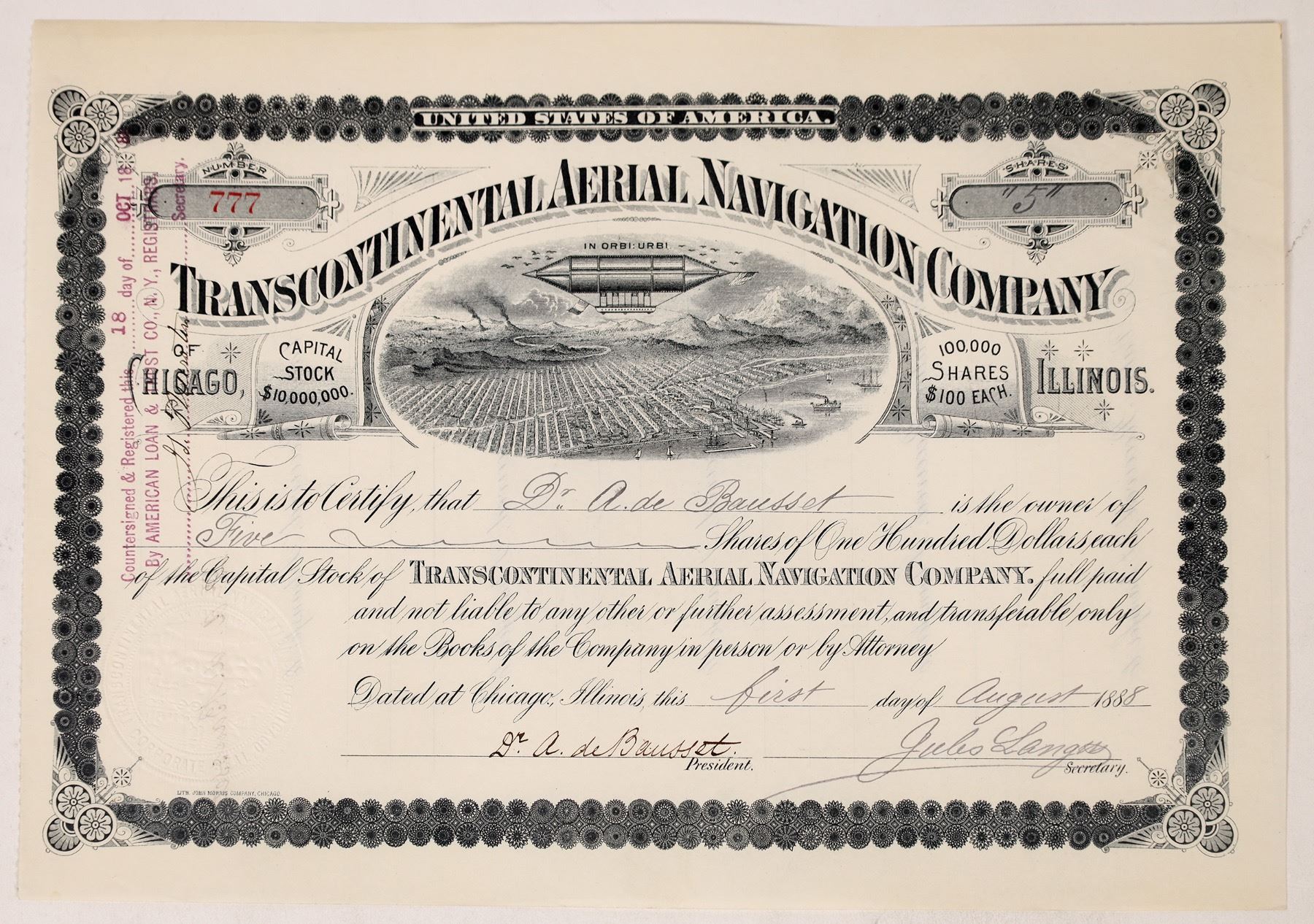 Transcontinental Aerial Navigation Co. Stock 1888. Incorp. 1888 Chicago Ill. #777, I/U, for 5 shares capital stock @ $100 ea. to Dr.A.de Bausett Aug. 1, 1888. Signed Dr.A. Bausett pres.Jules Langer sect.. Black border and print, vignette top center of and airship flying over the city "$10,000,000 stock, 100,000 shares" on either side. Embossed corp. seal lower left. John Morris Co. Chicago printer. This is issued to the inventor of the airship and president of the company.