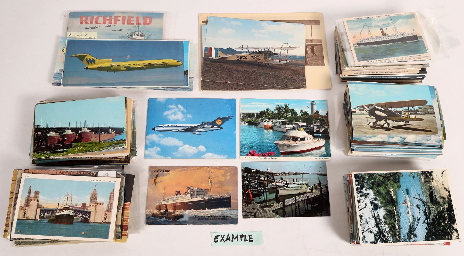 About 500 modern and older transportation postcards. Aviation, ships, cars, trains.