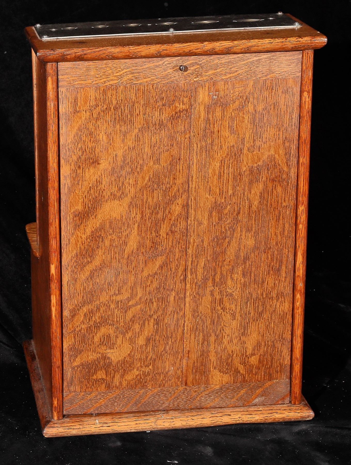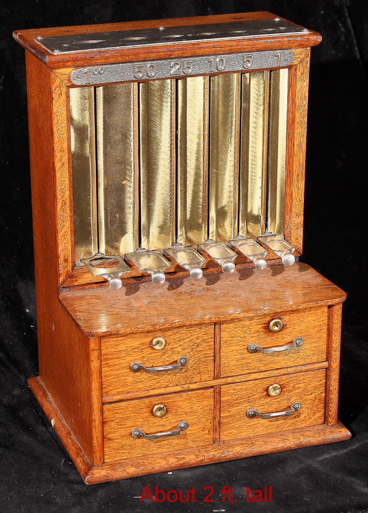 Transportation token fare collector, made of quartersawn white oak. Along the top are six slots for transportation tokens from 1c - $1. Mid-way are push tabs attached to a loud bell identifying transactions made. The slots at top are for tokens, not US coins, since the size and denomination of tokens matches the size of the slot, which is smaller than US coins. No manufacturers name found, and there are no original labels to let us know the exact operation of this machine. 12.5 x 19 x 10 inches, c1900-20.