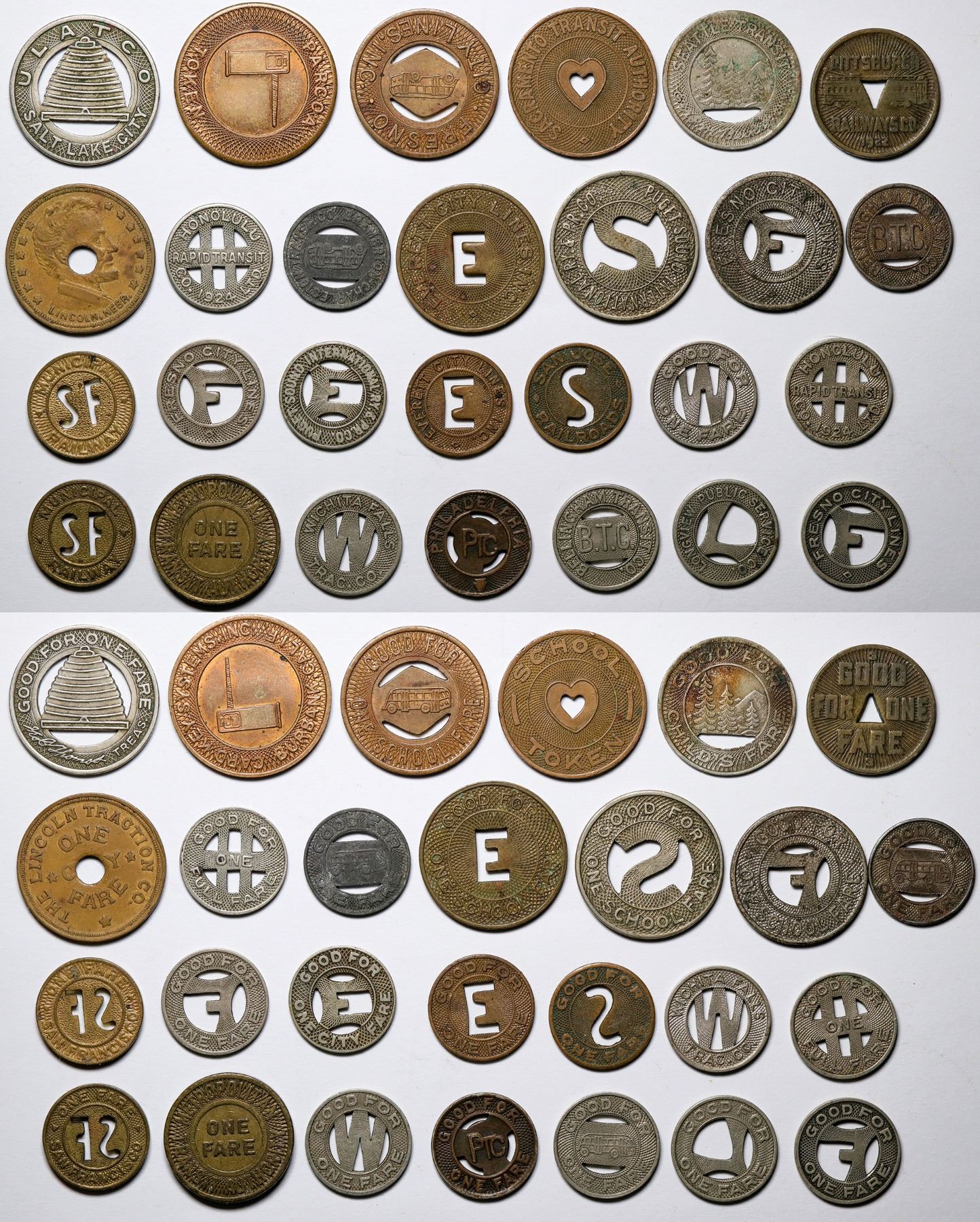 Lot of 26 transportation tokens from California, Washington, Hawaii, etc., from the 1920s. Includes a Lincoln, Nebraska, token with struck Lincoln bust and 13 stars representing the 13 original colonies, inscribed, "Lincoln, Nebr.," on the obverse, "The Lincoln Traction Co. One Fare," on the reverse. Hawaiian Transit token from 1924, Pittsburg Railways Co. from 1922, San Francisco, Sacramento and a lot more. See photos for details.