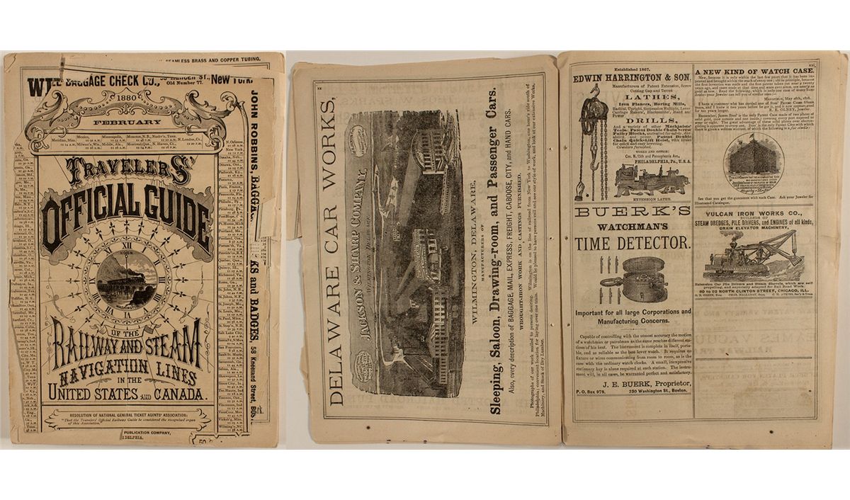 Containing railway time schedules, connections and distances, ocean and inland steam navigation routes, maps of principal lines and lists of general officers, general index of towns and villages on the various railways, (corrected and amended up to date) together with all such miscellaneous information relative to railway improvements and progress as may be useful to the traveling public, the business community and railway companies. Compiled and edited by W.F. Allen and published by the National Railway Publication Company. 341 pages. The spine is completely removed resulting in the pages becoming loose. The covers and first few pages are torn. There is no other listing of this edition in OCLC. Rarity: [i].City: County: State: Date:
