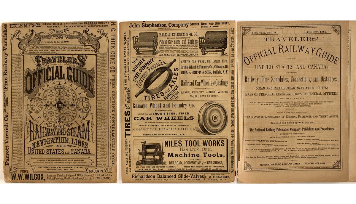 Containing railway time schedules, connections and distances, ocean and inland steam navigation routes, maps of principal lines and lists of general officers, general index of towns and villages on the various railways, (corrected and amended up to date) together with all such miscellaneous information relative to railway improvements and progress as may be useful to the traveling public, the business community and railway companies. Compiled and edited by W.F. Allen and published by the National Railway Publication Company. There is no other listing of this edition in OCLC. Rarity: [i].City: County: State: Date: