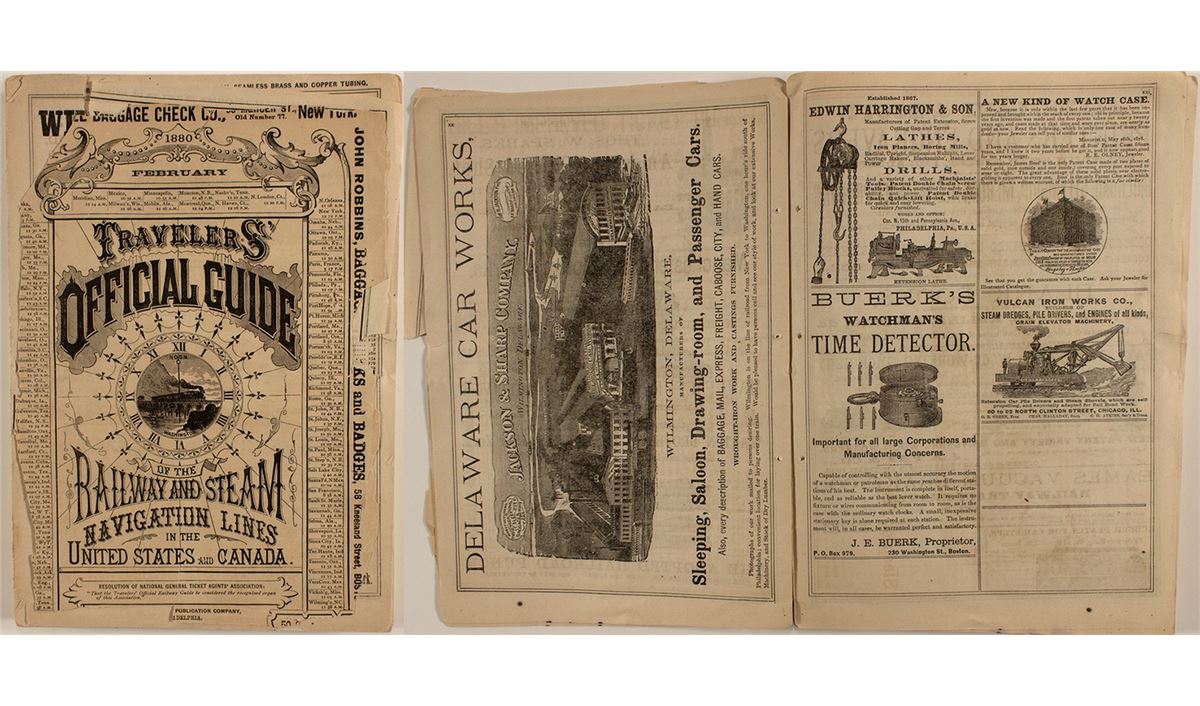 Containing railway time schedules, connections and distances, ocean and inland steam navigation routes, maps of principal lines and lists of general officers, general index of towns and villages on the various railways, (corrected and amended up to date) together with all such miscellaneous information relative to railway improvements and progress as may be useful to the traveling public, the business community and railway companies. Compiled and edited by W.F. Allen and published by the National Railway Publication Company. 341 pages. The spine is completely removed resulting in the pages becoming loose. The covers and first few pages are torn. There is no other listing of this edition in OCLC. Rarity: [i].