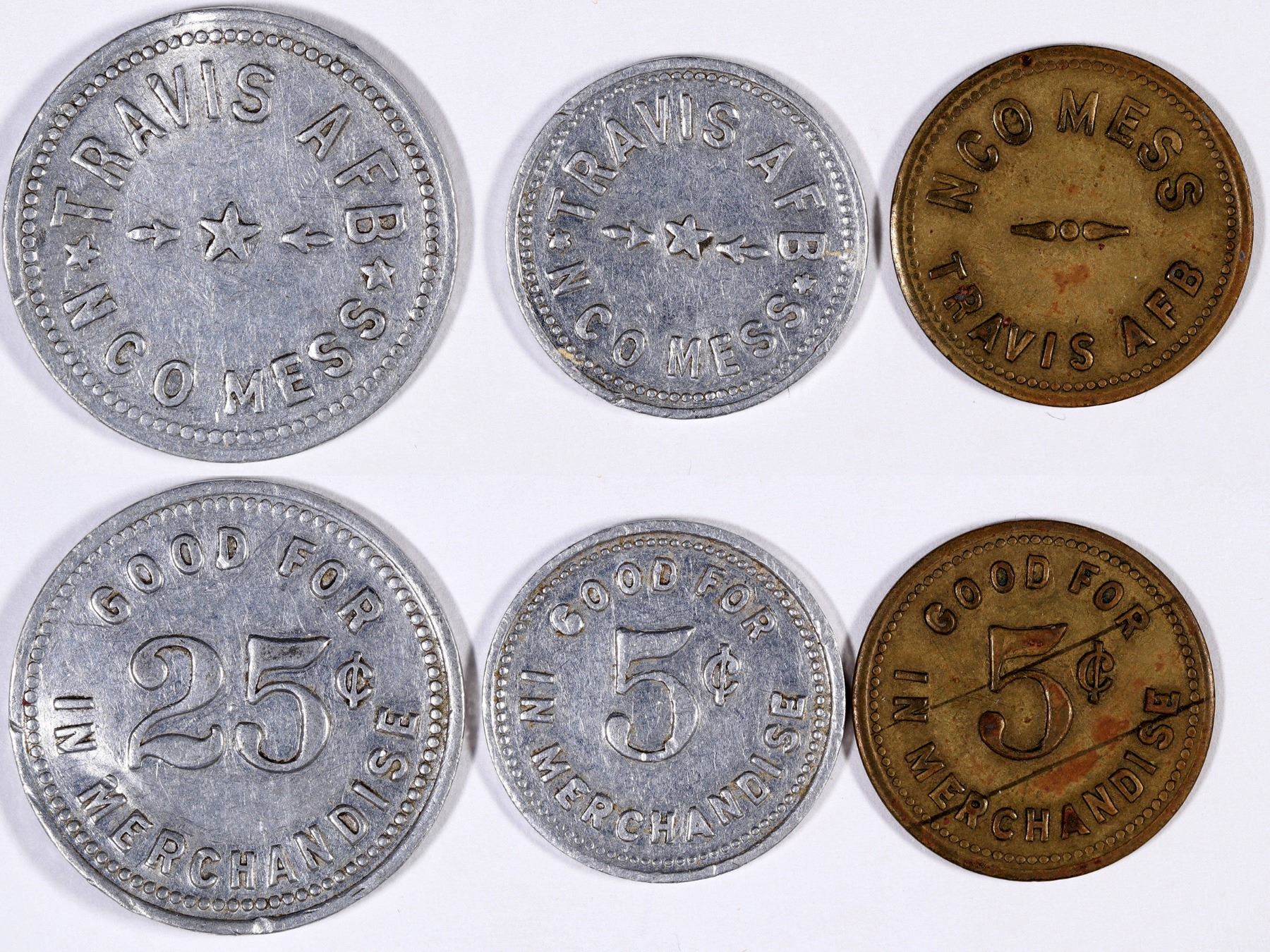 Lot of three different: 1) NCO MESS / TRAVIS AFB // GOOD FOR / 5¢ / IN MERCHANDISE; Br. rd., 21 mm. 2) TRAVIS AFB / NCO MESS // GOOD FOR / 5¢ / IN MERCHANDISE; Al. rd., 22 mm. 3) TRAVIS AFB / NCO MESS // GOOD FOR / 25¢ / IN MERCHANDISE; Al. Rd. 28 mm. Ex: Ron Lerch collection.