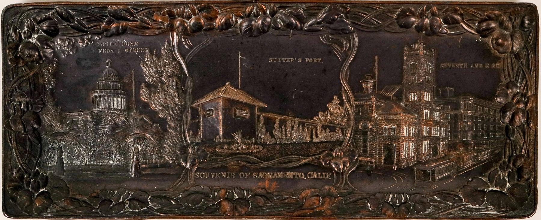 Copper colored metal tray, a souvenir of Sacramento, Calif., undated. Includes raised decorative pictures of the Capitol dome from L Street, Sutter's Fort, and Seventh and K Street, with street cars lining the street. Edged with raised floral design.