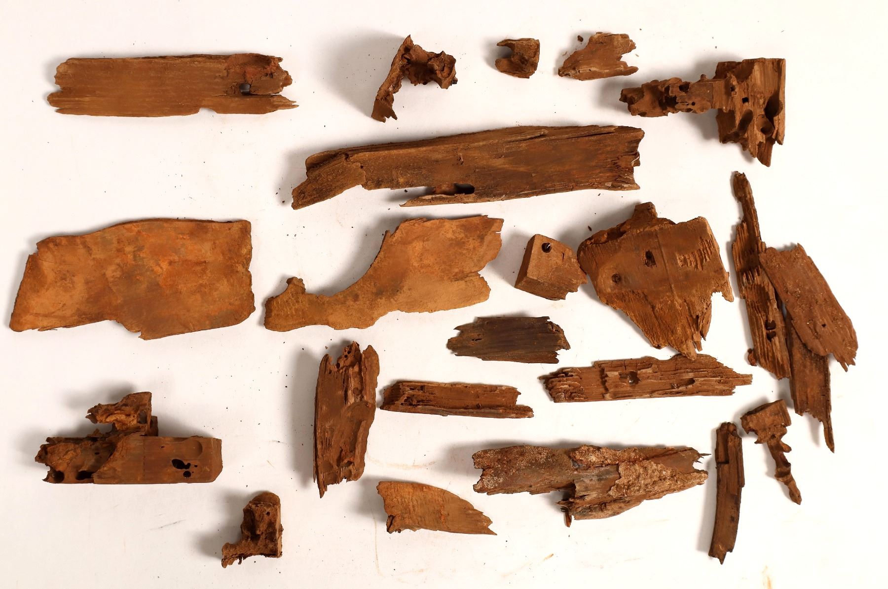 Treasure Box Parts with Stippled Seal from the SS Central America Treasure. Numerous wood parts from one of the dozens of wood treasure boxes from the "Garden of Gold" in the ship's locked and secure "gold room." One of the pieces has the remnants of an original red wax seal used to secure part of the box in a tamper-proof method. This wax seal appears to have a stippled pattern, possibly from a specific merchant rather than a bank, as most banks used specific self-identified seals. Private company gold was regularly shipped on the SSCA. Some was directly shipped by the customer. Others were contained under consignments through an express company (the two largest express shippers were Wells, Fargo and Freeman Express), or through a commission merchant. Commission merchants also acted as bankers, such as Alsop & Co. A story regarding commission merchants and bankers can be found in another section of this catalog.