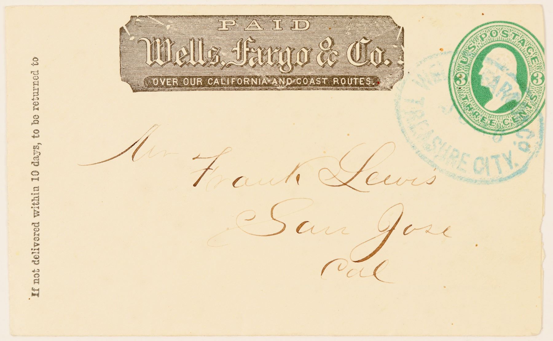 Second Treasure City Wells Fargo entire. This is addressed to Frank Lewis. Extremely fine strike! Story on Patty Reed's doll and biography of Patty and her husband Frank Lewis. This cover was surely sent by James Reed as Lewis ran the Reed San Jose businesses in James' absence.