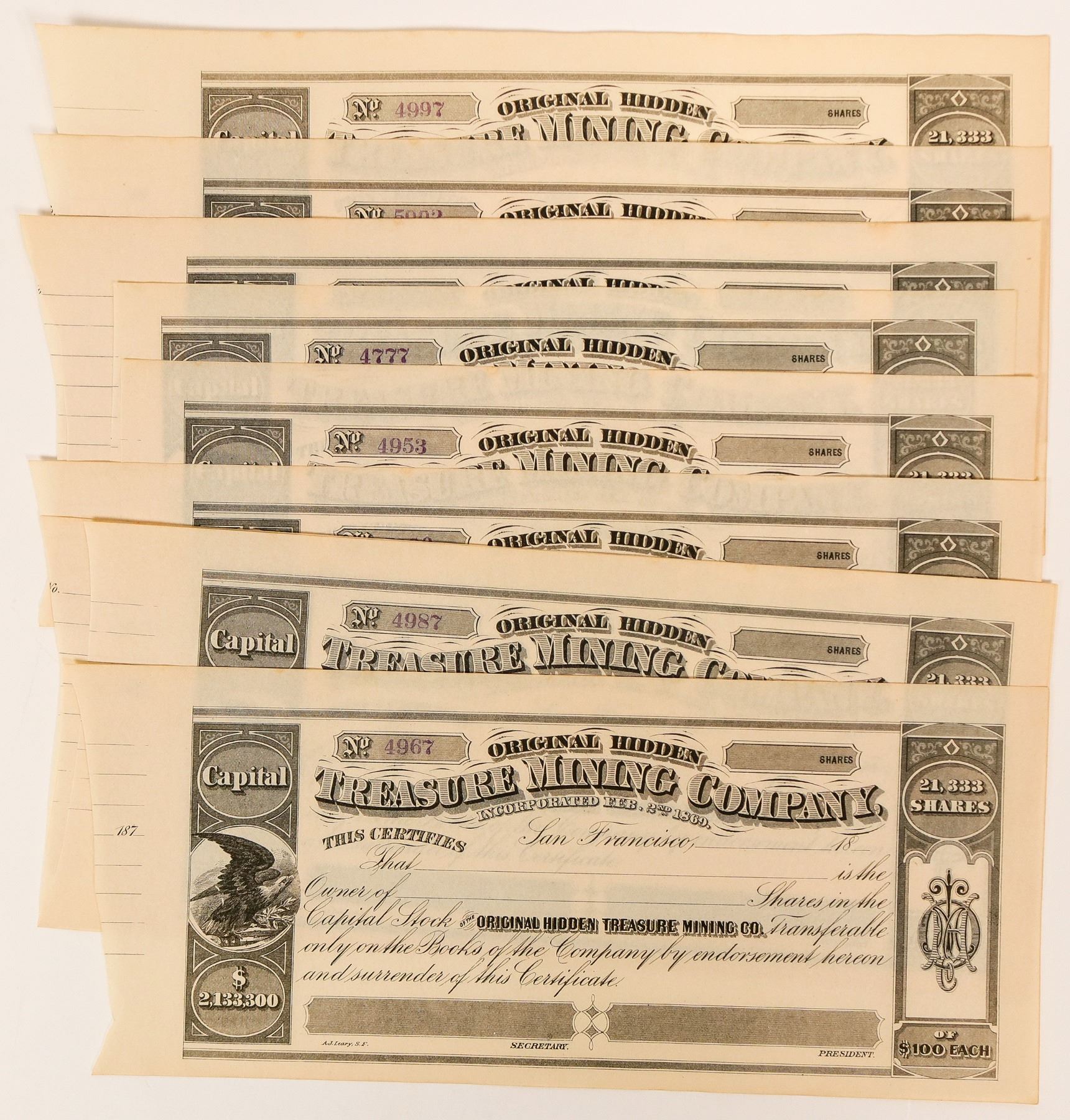 Ten stock certs issued by The Original Hidden Treasure Mining Company. These are unused, but torn on the side. Other than the ripped edge, they are in near new condition.