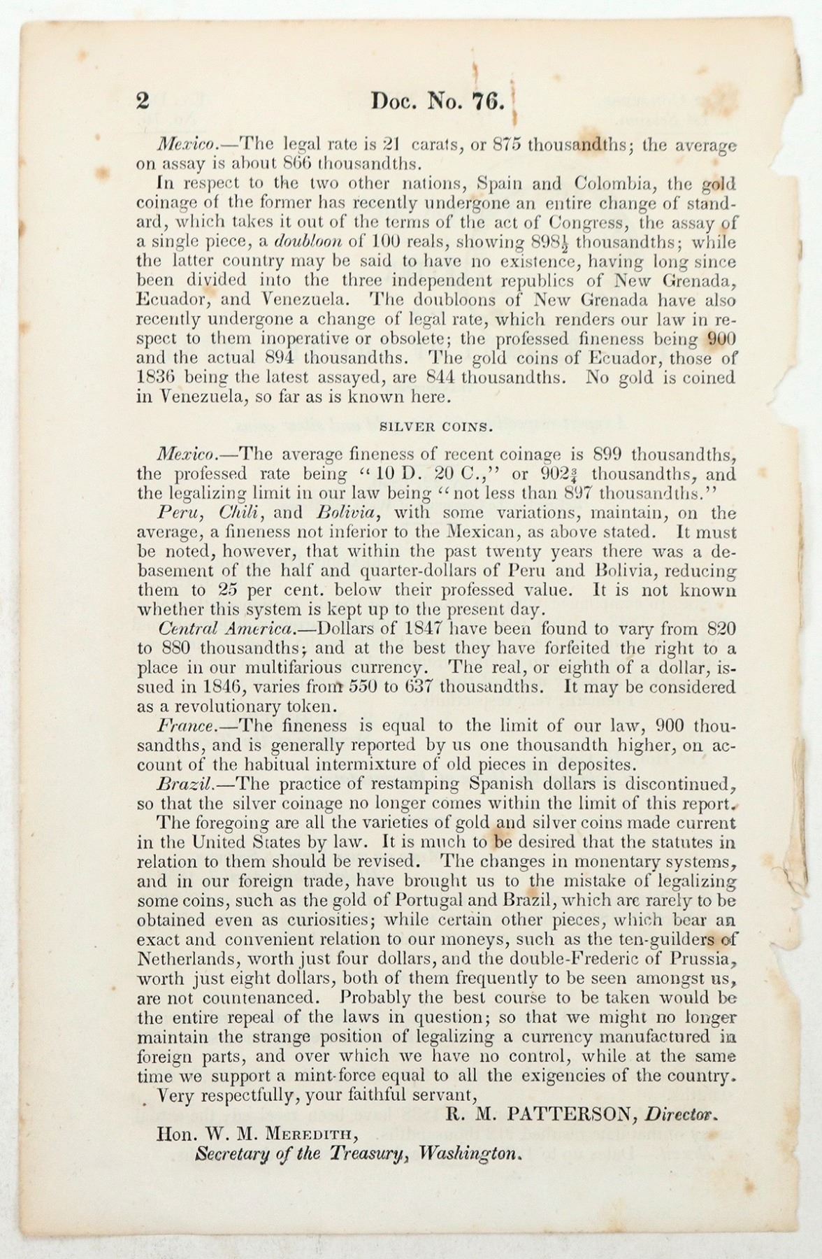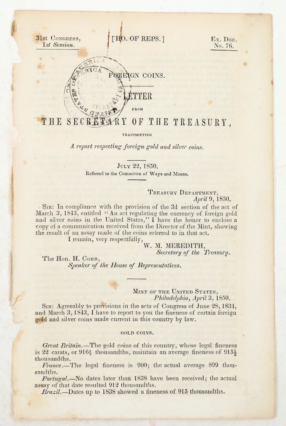 31st Congress House of Representatives letter from The Secretary of the Treasury W. M. Meredith reporting on the fineness of gold coins from other countries. Two pages, 5 1/2 x 9 inches, some tears on left edge.