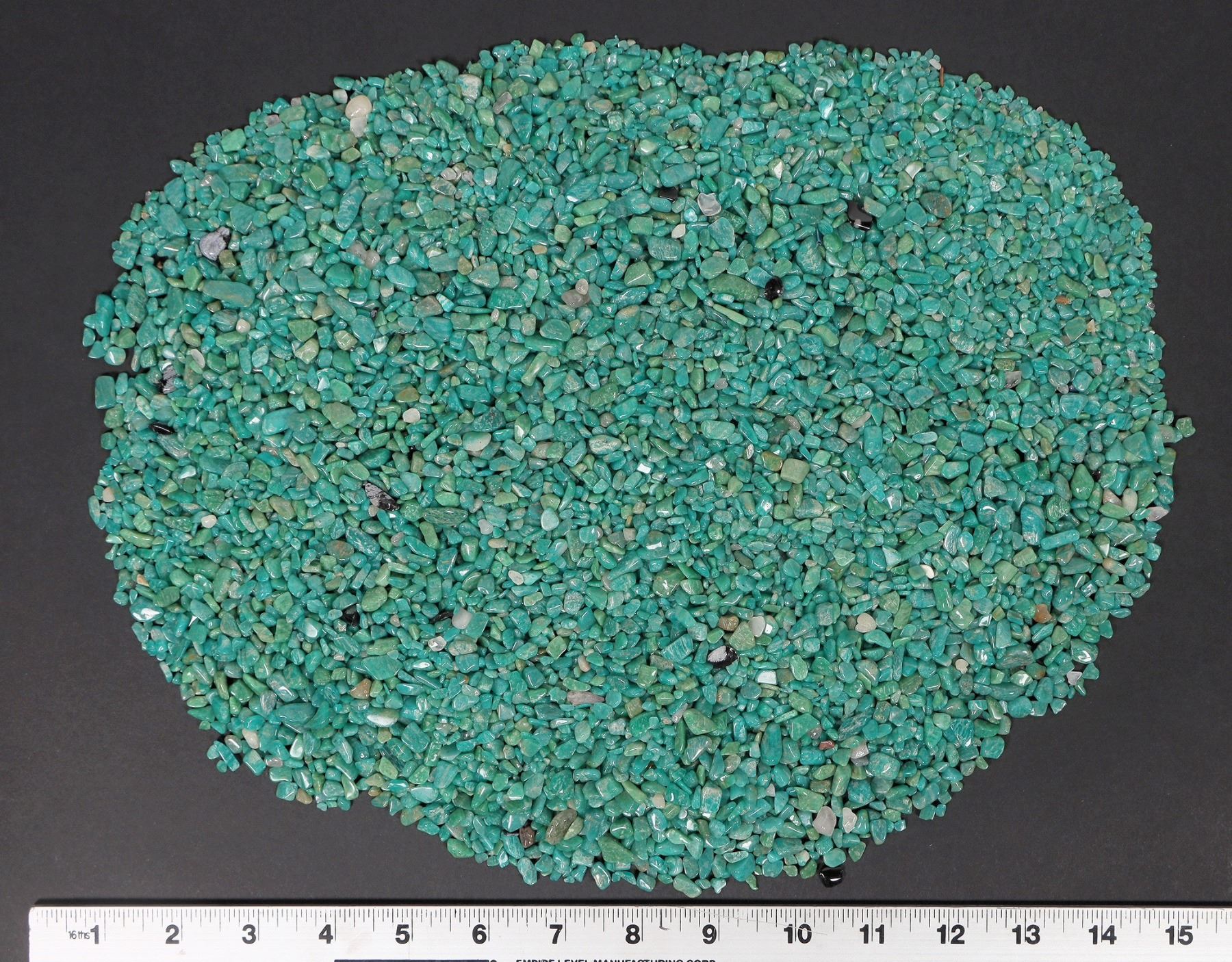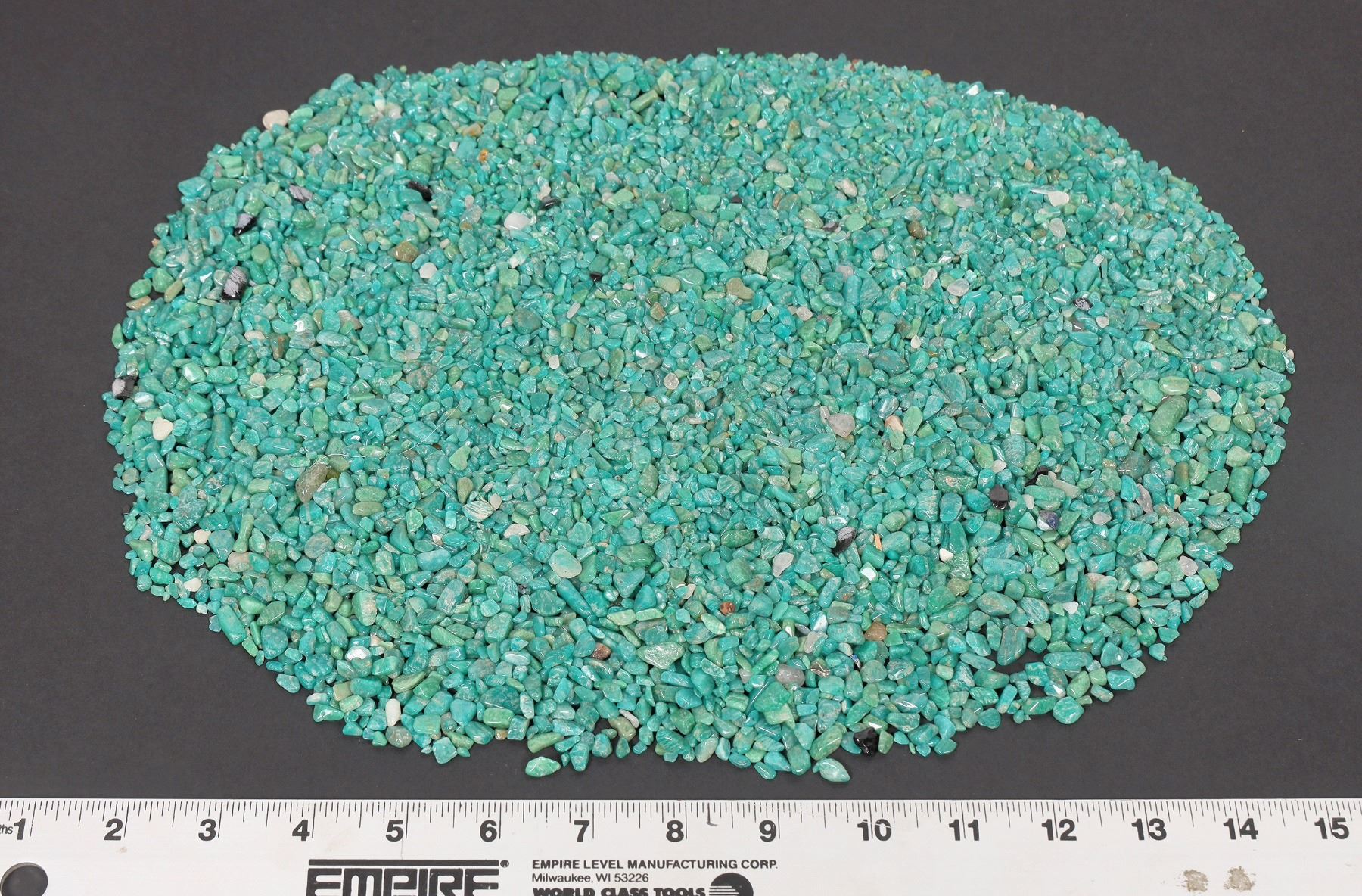 Tiny-small turquoise pieces, all treated, deep green-blue in color. Approximate weight 965 grams. Pieces in the lot range from around .2" to .75" in length. This turquoise originates from the No. 8 turquoise mine of Cortez, Nevada, often considered one of the top turquoise mines in the world. It was previously in storage for 35 years. These turquoise pieces were treated in the 1970s in pioneering turquoise experiments by a professor at the University of Nevada, Reno.