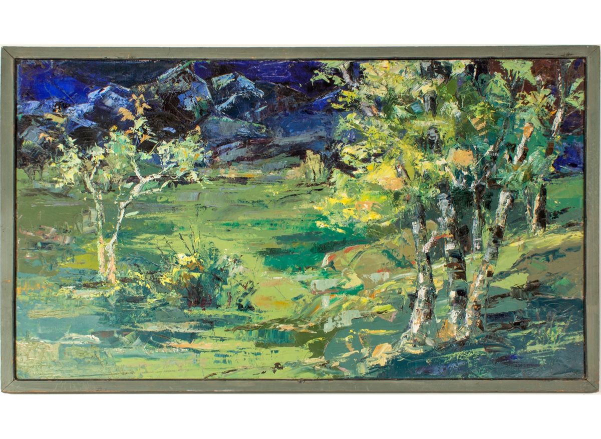 Oil landscape painting by Mildred Lane. (Framed: 26" H x 28" W). Predominately green painting of trees, blue mountains in the background, painting is worked with a pallete knife.
