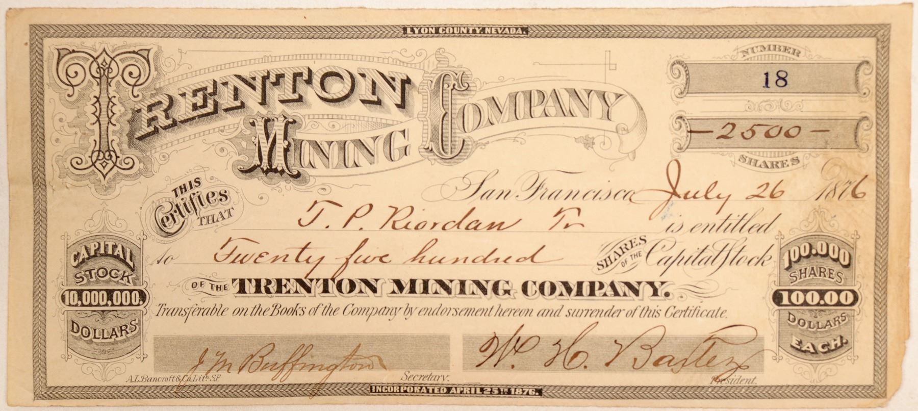"Lyon County, Nevada" printed at top center. Inc. April 1876. No. 18, issued for 2,500 shares to T.P. Riordan on July 26, 1876 in SF. Signed by president W.H. Baxter and secretary JM Buffington. Not cancelled. Black border and print, ornate logo. Printed by AL Bancroft & Co., SF. Pinholes, folds, soiling. 4 x 9" Located in the Devil's Gate District, Lyon County. Claim located a few hundred feet from Dayton and on the same ledge as the Justice and Kossuth. Developed by a double-compartment shaft sunk to 120 feet. Assays at $48. This stock was being sold to raise money to sink the shaft down deeper as valuable ore had been discovered on the same ledge at the 450 and 800 ft. levels in the Justice. [Ref: Annual Mining Review and Stock Ledger, 1876, pg. 70] Ken Prag Collection
