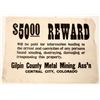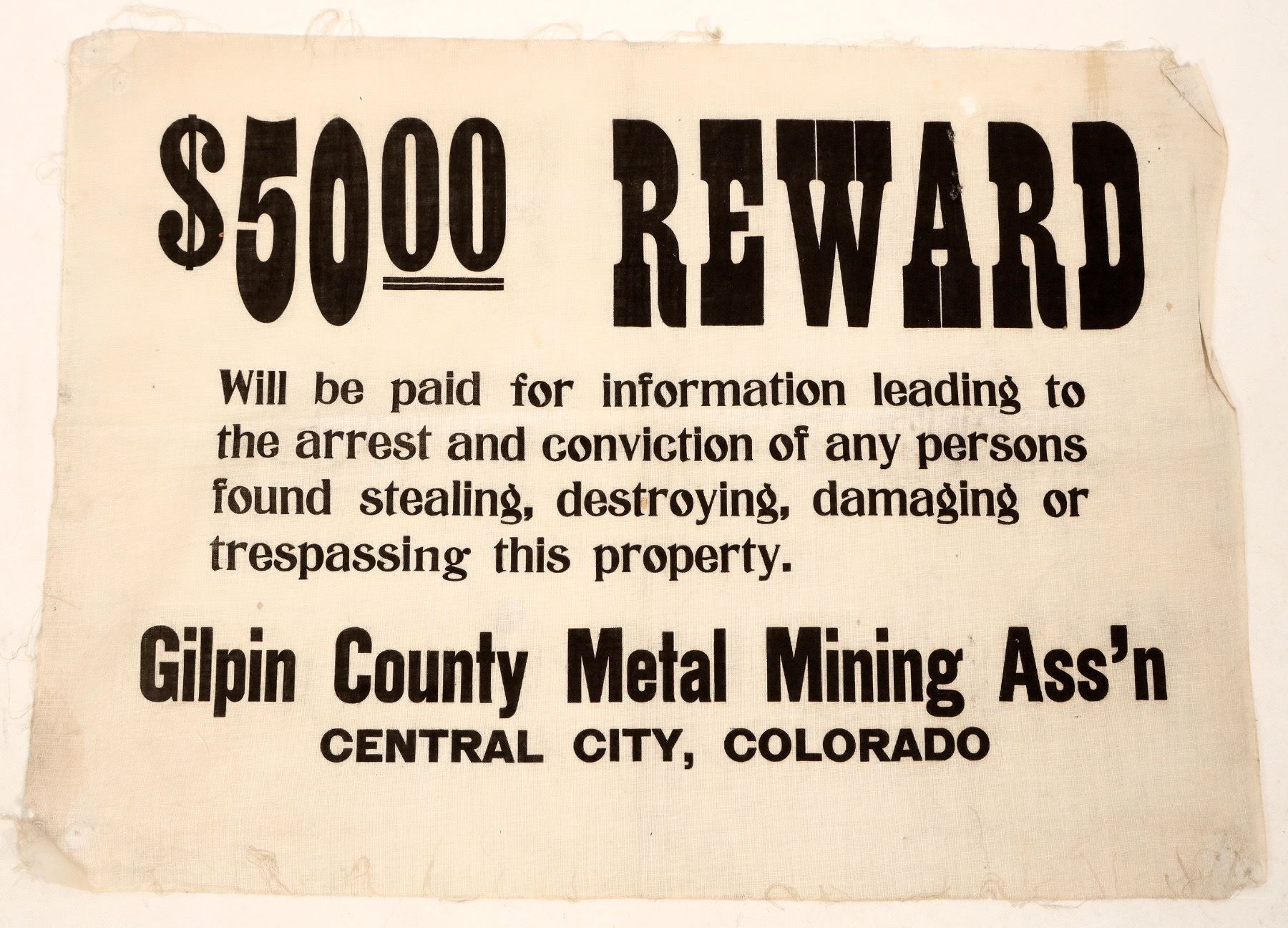 Rare Fabric Reward sign, from Gilpin County Metal Mining Association of Central City Colorado. Offering a $50 reward for information leading to the arrest of anyone found stealing, destroying, damaging the premises. Unusual sign, in excellent condition. Measures 17.5" x 12.5". Exceptional! [ Gilpin County Colorado