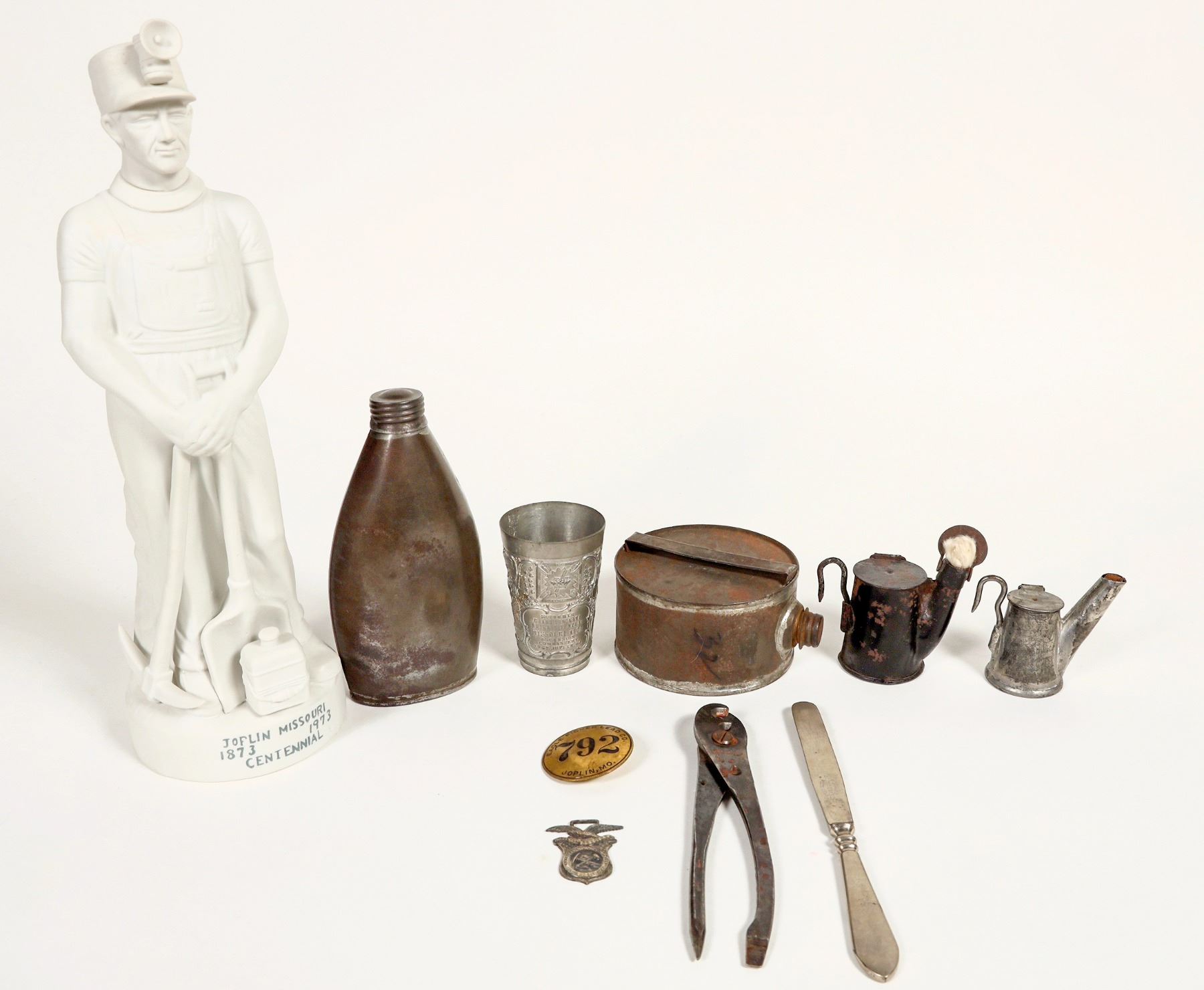 Lot of 10. 1) Carbide powder flask. Unmarked, but looks like Justrite pieces we have seen before. 6.75" tall. Appears early. 2) Canteen, possibly for water for carbide lamps based on the spout size. Unmarked. 2" high, 4" diameter. 3) Fuse crimper. Marked Wm. Schollhorn Co. 6.75" long. 4) Butter knife/spreader marked on one side, The Eagle-Picher Lead Co. Chicago, Ill., and on the other, Sublimed Picher White Lead. 7.5" 5) Fob from the American Mining Congress Annual Session in Joplin, Nov. 1907. 1.5" 6) Eagle-Picher Lead Co. employee pinback, brass, 1.75" diameter. 7) Souvenir metal cup from Grand Conclave Knights Templar Missouri 1906 with excellent raised illustrations of Joplin scenes. 3.5" tall, 2.25" diameter. 8-9) Two different oil wick lamps. One marked VL, 1909 patent. The other is USA Eagle, Janton & Son, Pennsylvania. 10) McCormick whiskey decanter of miner. Joplin centennial, 1973. 14" tall.