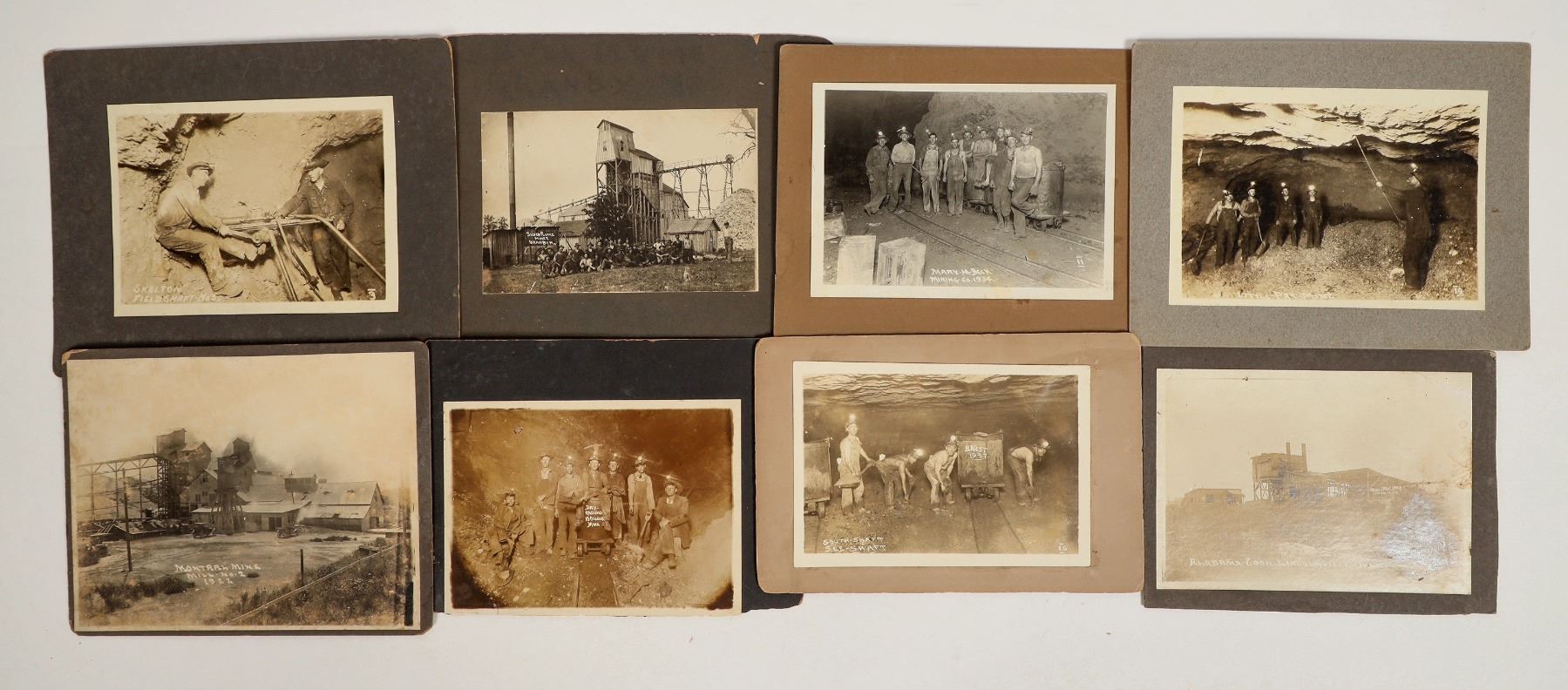 Lot of 8 different mining photographs, mostly underground, with the mine names identified. Photos are 4.25 x 6.5" up to 6.5 x 8.75". Includes: 1) Dry Ground 10 O'Clock Mine. Underground scene with seven miners with headlamps (and a few with pipes). 2) Mary M. Beck Mining Co., 1934. Underground scene with nine miners standing in front of ore carts and an Atlas powder box in front. 3) Little Pat Mine. Underground scene with 5 miners, one scaling. 4) South Shaft See Shaft, B West 1937. Underground scene of 4 miners with shovels next to ore cars. 5) Skelton Field Shaft No. 5. Underground scene showing two miners operating a drill. 6) Mine surface exterior in Lincolnville, Oklahoma. 7) Mine surface exterior, Silver Plume Mine, Granby, Missouri. Large group of miners posing in front of the mine/mill. 8) Mine surface exterior, Montral Mine, Mill No. 2, 1922. Couple of early automobiles in view. Please inspect.